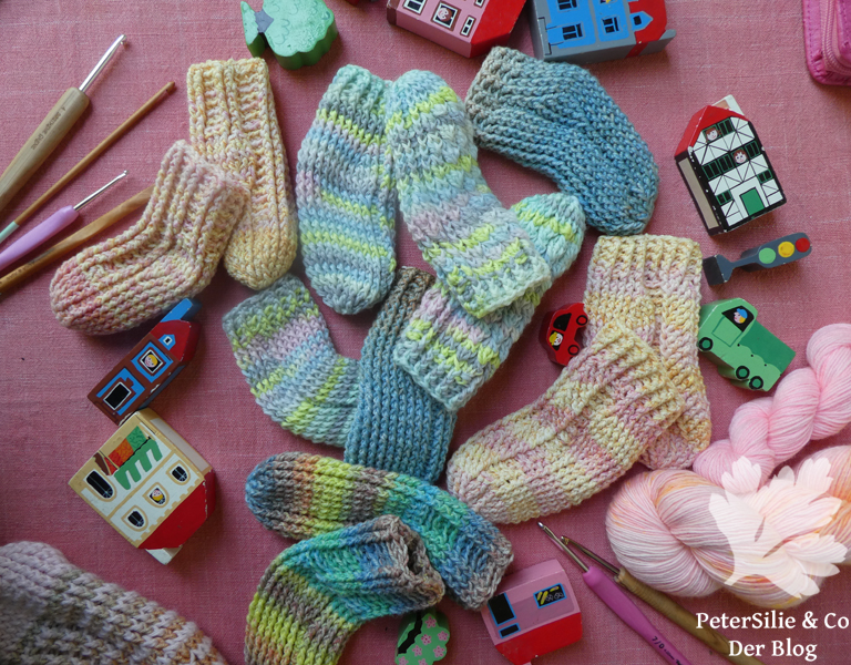 Das Erfreuliche: drei Babies im Bekanntenkreis, die behäkelt werden können. Babysocken sind mini und gehen schnell, perfekt also um die 10 Muster zu testen (naja nicht alle, aber die, die mir babytauglich erscheinen). Ich habe zwar für meine ersten Tests keine Sockenwolle verwendet, da wird der Socken noch ein bisschen dicker. Aber süss sind die trotzdem geworden.