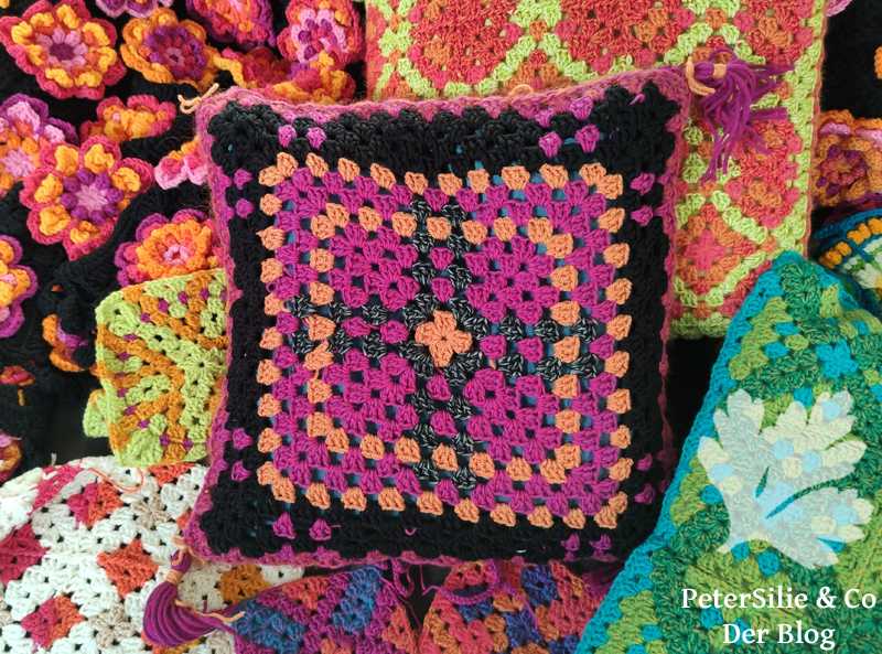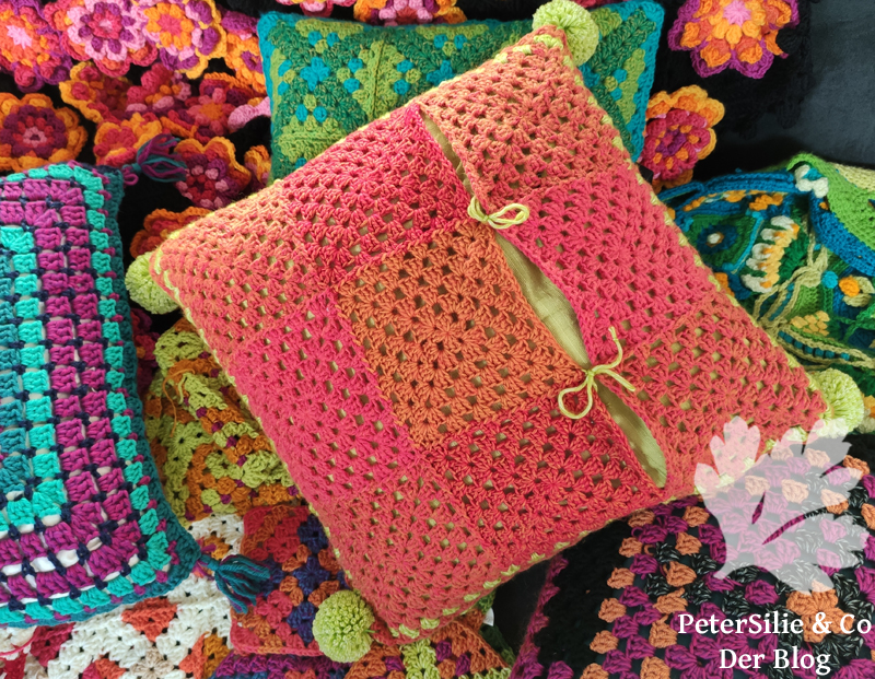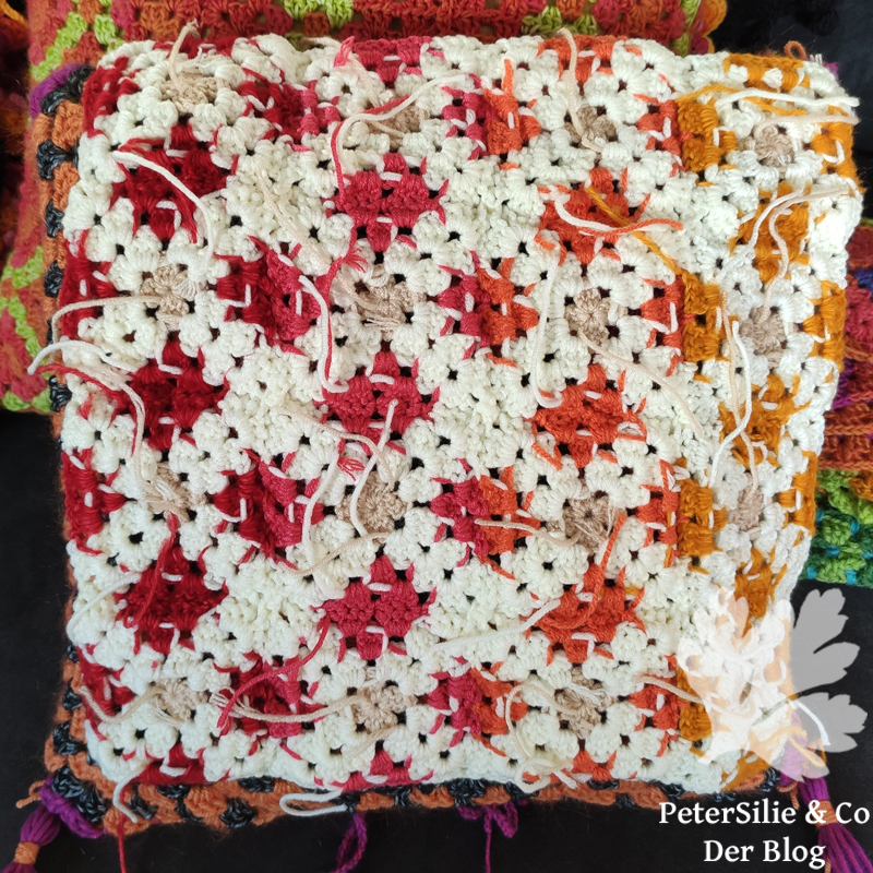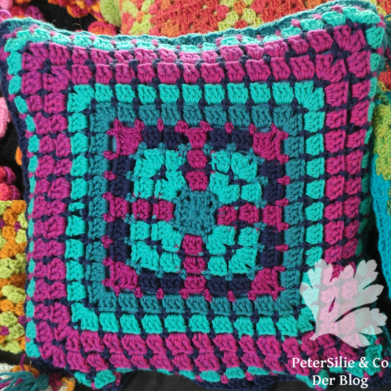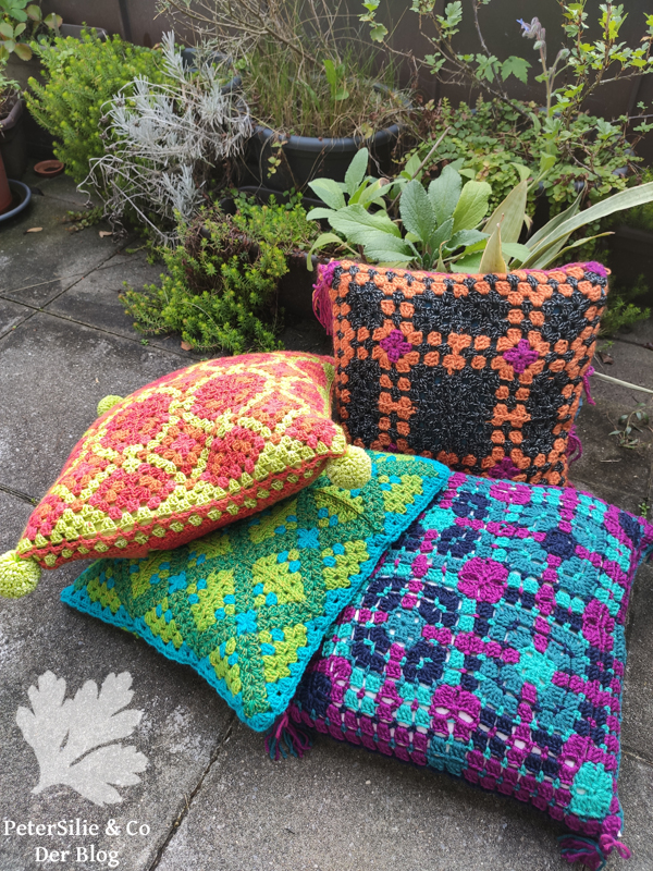 Die kleineren Muster (im Buch 9×9 cm, mit 2,5er Häkelnadeln) sehen im Polsterformat besser aus. Die 12 cm Granny Square werden mit der 4er Häkelnadel 18 cm gross und bei einer Polstergrösse von 40 cm funktioniert es zwar, aber ich denke entweder muss dann das Muster tatsächlich wie im Buch mit feinerer Wolle gearbeitet werden (hätte ich, aber so eine kleine Häkelnadel, hach!) oder halt in einem grösseren Projekt wie einer Decke oder einem, natürlich mit entsprechenden robuster Wolle, Teppich.