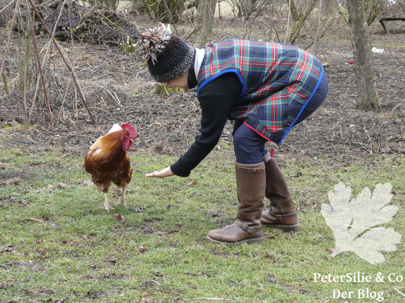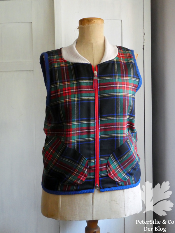 Mein nächster Versuch ist jüngsten Datums. Ich hatte große Lust auf Schottenkaro. Ich besitze einige Reststücke von meiner Mutter, teilweise zugeschnitten für irgendwelche Kleidungsstücke, teilweise im ganzen. Jedenfalls fand ich ein passendes Stück und war gleich ganz im Countrystyle unterwegs… Da es zwar ein schöner, aber doch etwas dünner Stoff ist, entschied ich die Weste mit Resten wattierten Futters zu doppeln. Die Kanten wollte ich mit altem Wollband, wie man es für Lodenjanker verwendet (ebenfalls von meiner Mama) umfassen. Das war leicht und sieht gut aus. Das mit dem Futter ist zwar praktisch und erhöht die Einsatzfähigkeit enorm, war aber bei der Herstellung etwas aufwendiger. Sehr gut könnte ich mir das Modell aus beidseitig verwendbarem Steppstoff vorstellen. Mit einem Wort meine Schottenkaroweste ist nicht perfekt (Karo vorne und ein paar andere Kleinigkeiten…), sieht aber sehr gut aus und ist praktisch. Dafür habe ich sie am Halsausschnitt innen mit einem schönen, schmucken Schrägband als Necktape verziert.