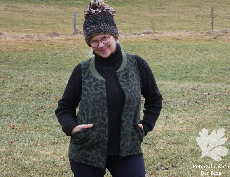Das Originalmodell ist aus Leinen genäht. Ich könnte mir auch Jeans gut vorstellen. Da es bei uns eher kalt als warm ist, tendiere ich halt mehr zu wärmeren Materialien, wie Wollstoff, Walk, Loden. Das erste gut passende Modell entstand aus einem originellen, dunkelgrünen Leoprintplüsch. Daraus habe ich auch einen Fischerhut genäht, aber die Weste ging sich noch aus. Mit einem schwarzen Pulli und schwarzer Hose sieht sie sogar richtig apart aus, City tauglich sozusagen.