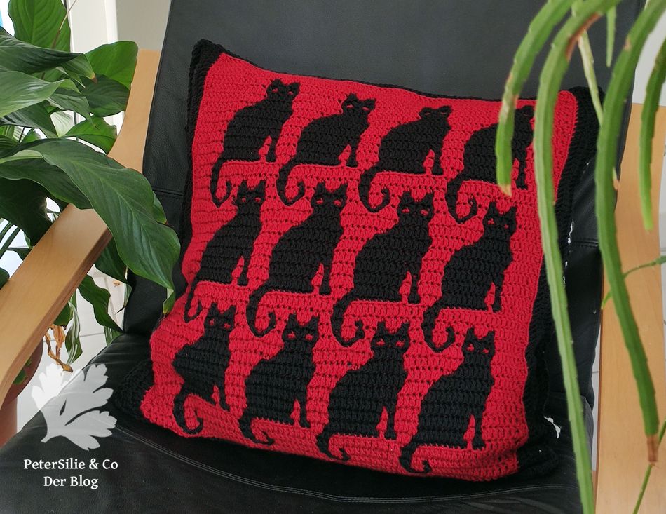 Der Polster ist zwecks Pflegeleichtigkeit mit Schachenmayr Soft and Easy gehäkelt und zwar mit einer 4,5 Häkelnadel. Geplant war ein 40×40 cm Polster, die Katzen wurden allerdings 47 cm hoch und so musste ich umplanen. (Seitlich anstückeln)