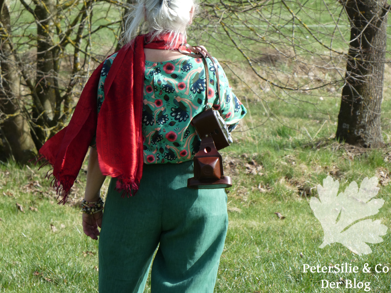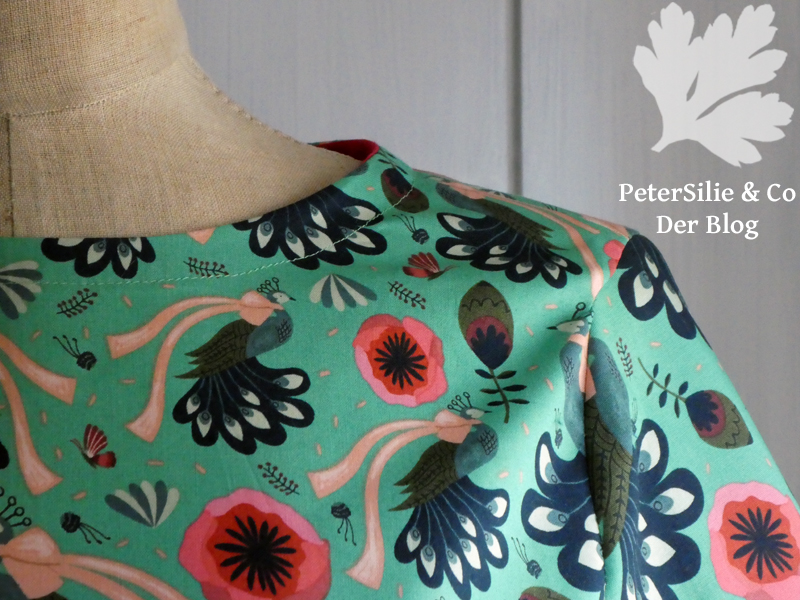 Nach der, nähtechnisch trotzdem aufwendigeren, Seide und dem strengen Schwarz/Weiß stand mir der Sinn nach handfester Baumwolle und vor allem: Farbe, Farbe, Farbe. Dieser grüne Print mit schleifengeschmückten Pfauen und Blumen ist von Sabine und sie hatte überhaupt keine Ahnung mehr, wieso er sich in ihrem Schrank befand. Das Material ist gut, eher fest, wie gute Patchworkstoffe. Aber ich war gerade beim Blusennähen, daher entstand Modell Nummer 2 in etwas ungewöhnlicher Farbkombination. Den Halsausschnitt habe ich mit einem farblich kontrastierenden Schrägband versäubert.
