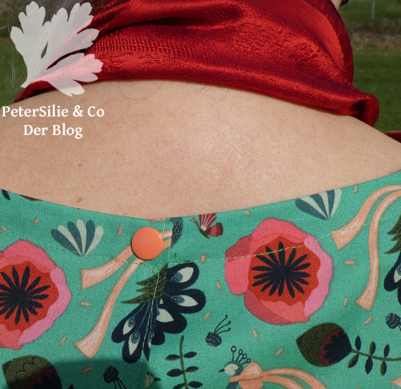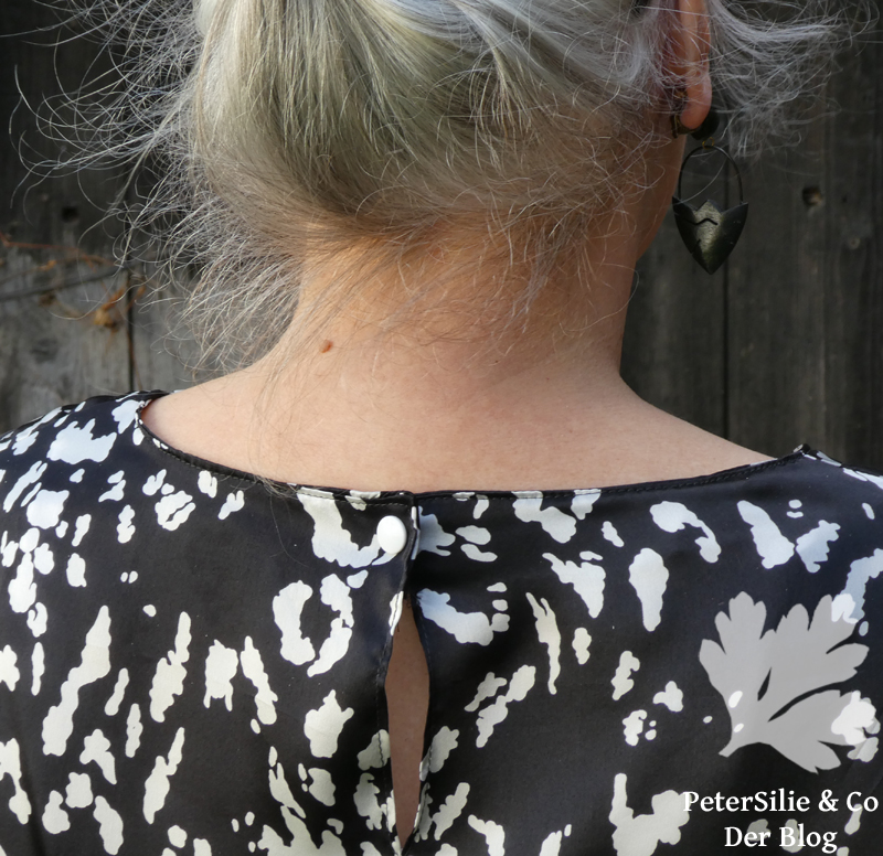 Entschieden habe ich mich für die Modelle 18-21 aus der Zeitschrift Simplicity Meine Nähmode 2/2017. Es ist ein einfacher kastiger Schnitt mit Schlitzverschluss in der Rückennaht, Brustabnähern vorne, Seitenschlitzen, ärmellos oder mit unterschiedlich gestalteten Ärmeln (in dreiviertel Länge, kurz mit kontrastierender Ärmelblende oder mit angesetzter Rüsche). Mein Modell aus Seide erhielt Ärmel „solang der Stoff reicht“. Statt einer Schlaufe aus Gummikordel und Knopf erhielten die Seidebluse und die grüne Printbluse den Verschluss für die ganz Eiligen: farblich passende Kamsnaps…