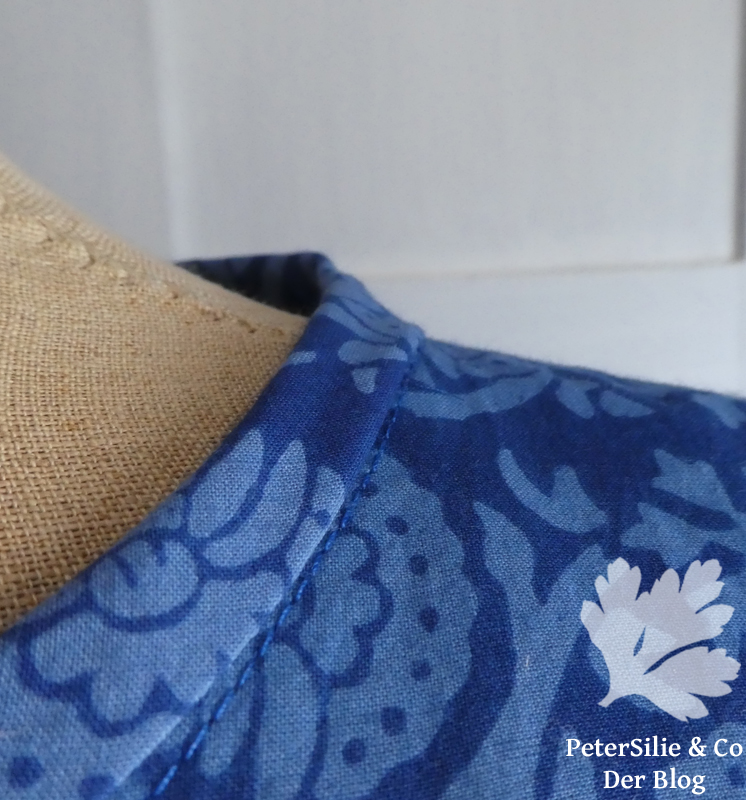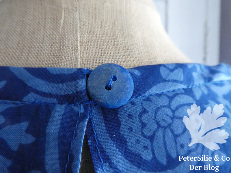 Das letzte Modell ist aus blauem, indischen Blockprint mit Bordüre von Karlotta Pink . Es ist ein zauberhafter Stoff, sehr dünn und leicht Stoff und sehr angenehm zu vernähen. Ich liebe diese zarten Stoffe besonders im Sommer. Der Halsauschnitt ist mit Schrägbändern aus demselben Stoff gearbeitet und der Verschluss diesmal eine genähte Schlaufe mit Knopf.