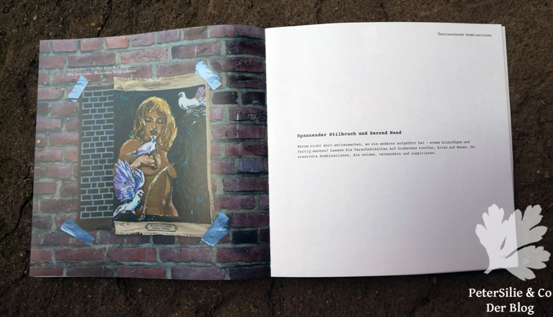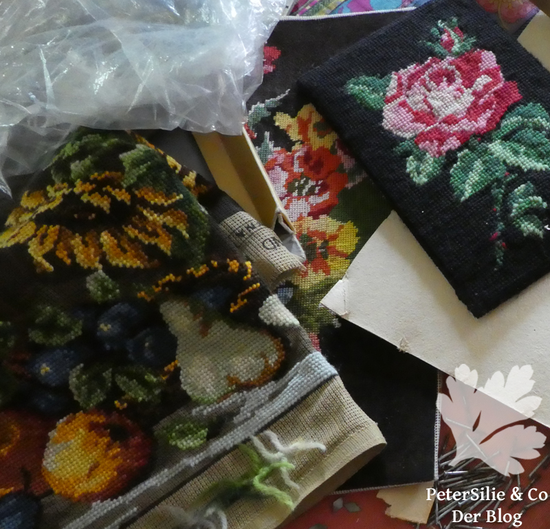 Nach dem Projektteil zeigt die Autorin Maria Snare Johnsson verschiedene Stickbeispiele als möglich Inspiration (dazu gibt es keine Anleitung): Buchstaben und Ziffern, dann folgt das Kapitel Bekannte Motive sticken. Hier zeigt sie uns witzige Umsetzungen von Süßigkeiten oder nordischem Geschirrdesign. Den Abschluss des Buches bildet ein herrliches Kapitel namens Überraschende Kombinationen. Dabei geht es um alte Gobelinbilder, wie man sie fertig oder halbfertig oft auf Flohmärkten findet. Zu diesen alten Arbeiten ergänzt Maria Snare Johnsson entweder den oft fehlenden Hintergrund (wer kennt das nicht: die Rosen sind fertig und jetzt wird es fad!) mit grafischen Mustern (oft in strengem Schwarz/Weiß) oder fügt dem fertigen Bild einen Streifen an, wobei sie Farben des alten Bildes aufgreift. Diese Beispiele haben mich so begeistert, dass ich sofort den nächsten Flohmarkt besuchte und dort tatsächlich fündig wurde. Nur bin ich noch nicht dazu gekommen mit meinen Erwerbungen zu experimentieren.