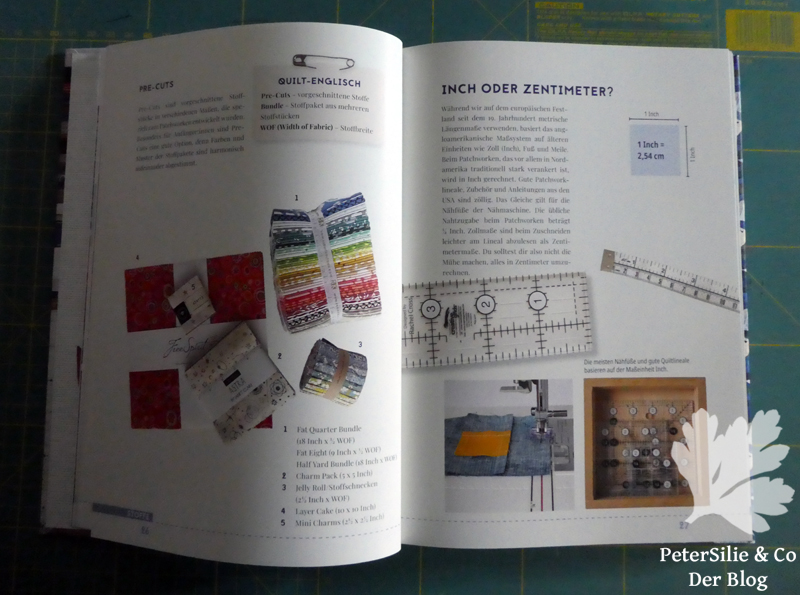 Im Kapitel Grundlagen geht es um die Ausstattung, also das notwendige Zubehör an Scheren, Messern, Nadeln, Lineal und Schneidematte… Sehr gut gefällt mir, dass die Autorin Uta Hanson betont, dass es heutzutage zwar jede Menge Schnickschnack für das Patchworken und Quilten gibt. Vieles davon ist jedoch nicht unbedingt entscheidend fürs Arbeiten, manches dagegen sehr wohl: eine gute Schere z.B. Sie zeigt und stellt viele Hilfsmittel vor und bespricht ihren Verwendungszweck (von etlichen Dingen hörte ich das erste Mal: Seamroller, Clapper…) Und sagt auch, wenn es für etwas noch nicht wirklich die ideale Lösung gibt: ein optimales Hilsmittel zum Markieren, das keine Spuren hinterlässt. Dann stellt sie die Designwand, unterschiedliche Stoffe und ihre Patchworktauglichkeit vor, behandelt wichtige Begriffe für den Umgang mit Stoff, Vor- und Nachteile von Pre-Cuts (vorgeschnittenen Stoffen) und widmet sich der Frage Inch oder Zentimeter. Das erinnert mich wieder an eine Aussage meiner Mutter: „Die anderen (Kursteilnehmerinnen) arbeiten mit Inch, das ist so kompliziert…“ Dazu habe ich damals keine Stellung bezogen, erstens weil mich Patchworken zu diesem Zeitpunkt absolut nicht interessierte und mit den Maßen bin ich sowieso nicht gut…Aber die Argumente, die die Autorin für Inch bringt, sind durchwegs logisch (ich bin übrigens auch ein Zentimetertiger…). Waschen, Bügeln, Nähnadeln, Nähmaschine, Garne, Wattierungen und eine kurze Einleitung über Farben und Farbwirkung schließen das Kapitel Grundlagen ab.