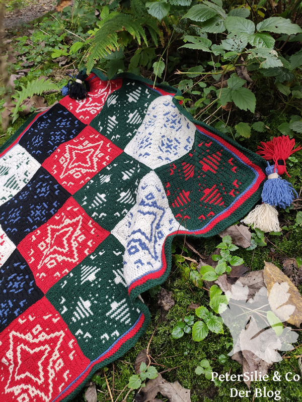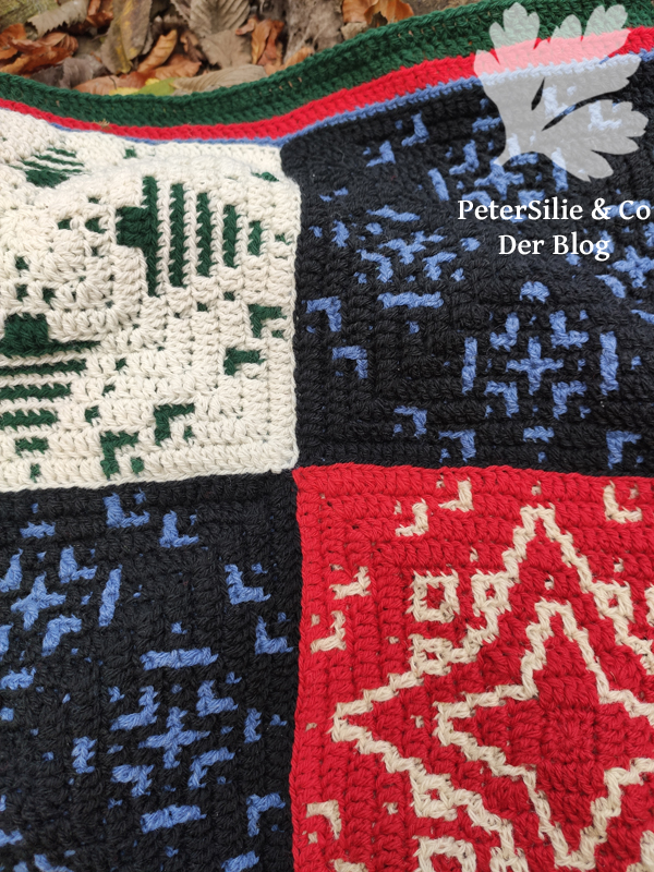 Also habe ich noch vier mehr Quadrate gehäkelt, sodass ich je vier Quadrate pro Farbe hatte, vier Schwarz, vier Grün, vier Weiss und vier Rot. Beim Grün verwendete ich nur das Baummotiv, beim Rot den Stern und beim Schwarz die Schneeflocke, nur beim Weiss hatte ich alle vier unterschiedlich gestaltet, beim Motiv und der Kontrastfarbe.