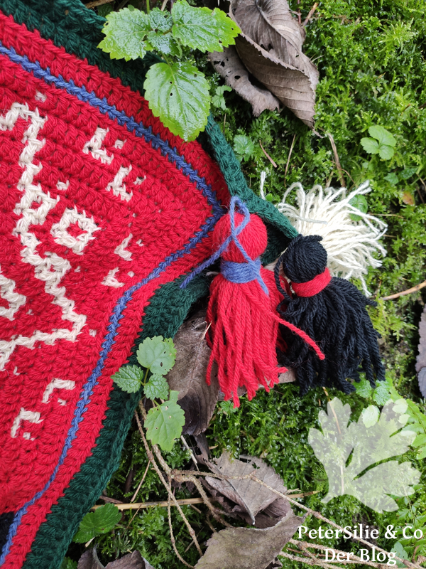 Nach kurzer Zeit stand die Anordnung fest und ich begann an einem gemütlichen Sonntag mit dem Zusammennähen. Und nach einem langen Nachmittag des Nähens war nur noch die Umrandung zu häkeln. Zuerst eine Reihe feste Maschen in blau, dann rote Stäbchen und zum Schluss zwei Reihen grün. Und weil ich ja schon fast fertig war, auch noch die Quasten. Hier habe ich all meine Reste verwertet und das Grün und Rot komplett aufgebraucht, nur vom Blau und Schwarz und dem untergemischten Weiss blieb Wolle über.