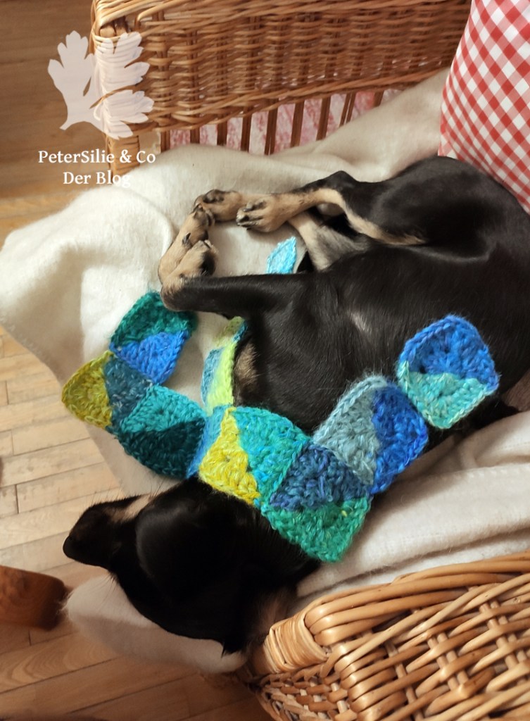 Ich habe also einfach viele Granny Squares gehäkelt und dann mal zusammen genäht und provisorisch an den schlafenden Hund gehalten. Bei der ersten richtigen Anprobe am stehenden Hund, zeigte sich alles zu lang und zu weit. Also ein bisschen auftrennen, Granny Squares entfernen und neu zusammen nähen. Auch jetzt ist das Mäntelchen Richtung Taille, wie man auf den Fotos sieht, etwas zu weit. Da sieht Twinni gleich nochmals schlanker aus.