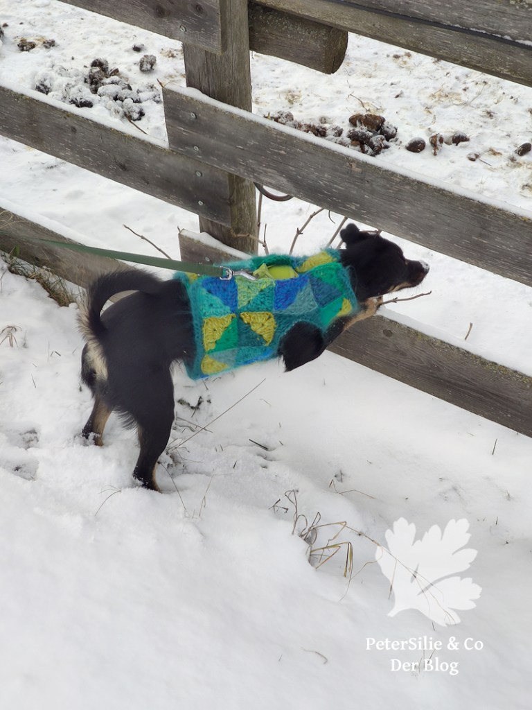 Mit Wollresten aus Mamas Wolltruhe habe ich über die Feiertage für Hundedame Twinni ein Mäntelchen gehäkelt. Twinni ist zwar Kurzhaar, aber sie hatte bisher nur vor Aufregung gezittert, weil sie doch nicht dieser einen verlockenden Spur folgen durfte. Twinni ist ein absoluter Schnuffelhund, beim Spaziergang mit ihr ist grundsätzlich ihre Nase am Boden. Manchmal wundere ich mich, was sie alles mehr mitbekommt, als wir Menschen, diese Welt von Geruchsspuren bleibt uns ja gänzlich verschlossen.