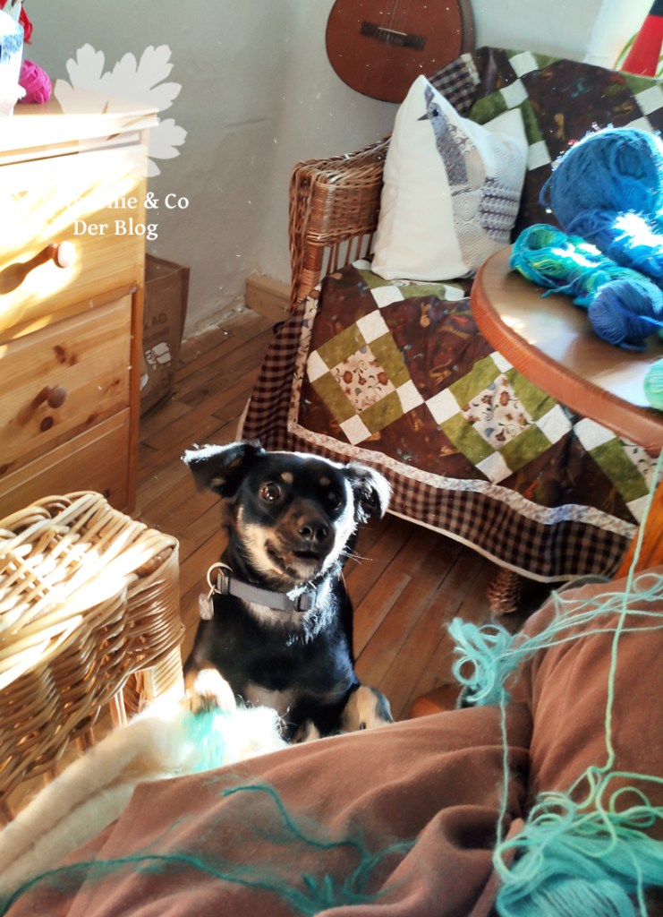 Jedenfalls ist sie klein, kurzhaarig und schwarz und wieder erwarten nicht ein Pinscher Mix, sondern eine bunte Mischung diverser Hunderassen von klein bis gross von Schosshund bis Hüte- oder Jagdhund, aber mit den meisten Anteil (20 Prozent) Chihuahua, Parson Russel Terrier 17% und Pekingese 16%. Aber bei kurzem Fell bietet es sich an ein kleines buntes Jäckchen zu machen. Zuerst dachte ich an Rot, aber schlussendlich landete ich bei Türkis, Grün und Blau, Hauptsache ein guter Kontrast zum Schwarz. Da gab es eine schöne Auswahl an Wollresten von Merino, Mohair und Kid Silk. Ja, die kleine Zwetschke kriegt ein Luxusstück.