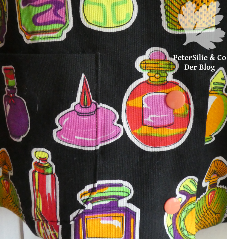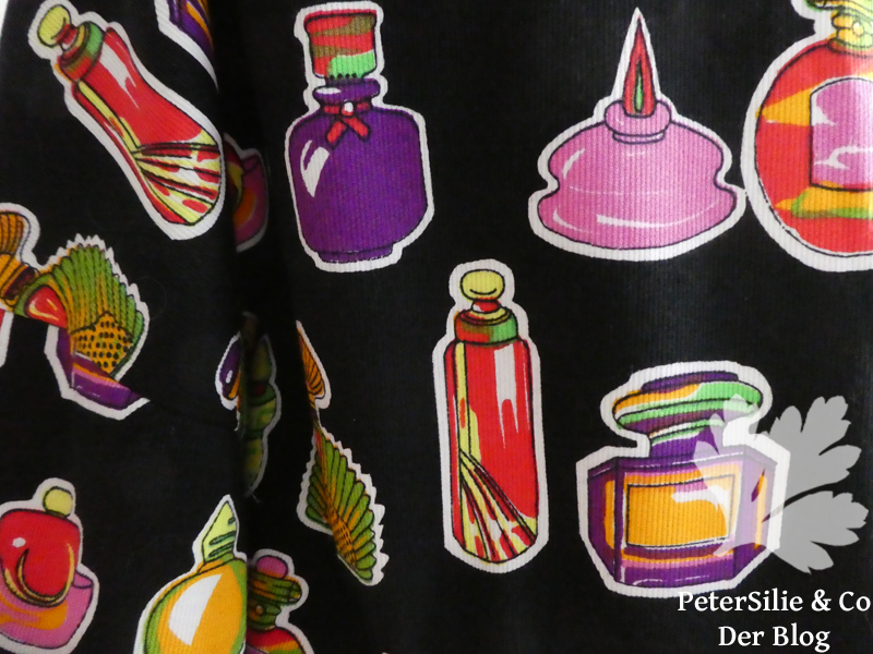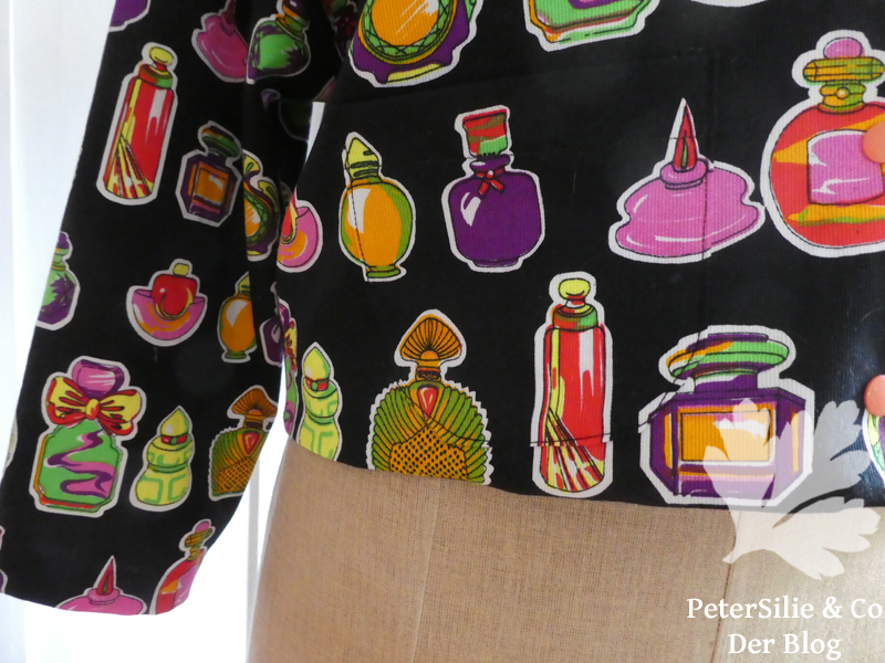 Der Webstoff dagegen hat ein sehr ausgeprägtes Muster, da war die Angelegenheit etwas kniffliger. Der originelle Print mit Parfumflakons stammt aus dem Stoffschatz meiner Mutter, für diesen Stoff suche ich schon lange einen Schnitt. Der Stoff hat eine leichte senkrechte Struktur, etwa wie Babycord, was ihm einen zusätzlichen Reiz verleiht.