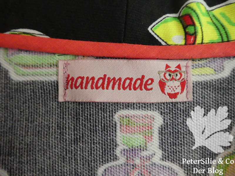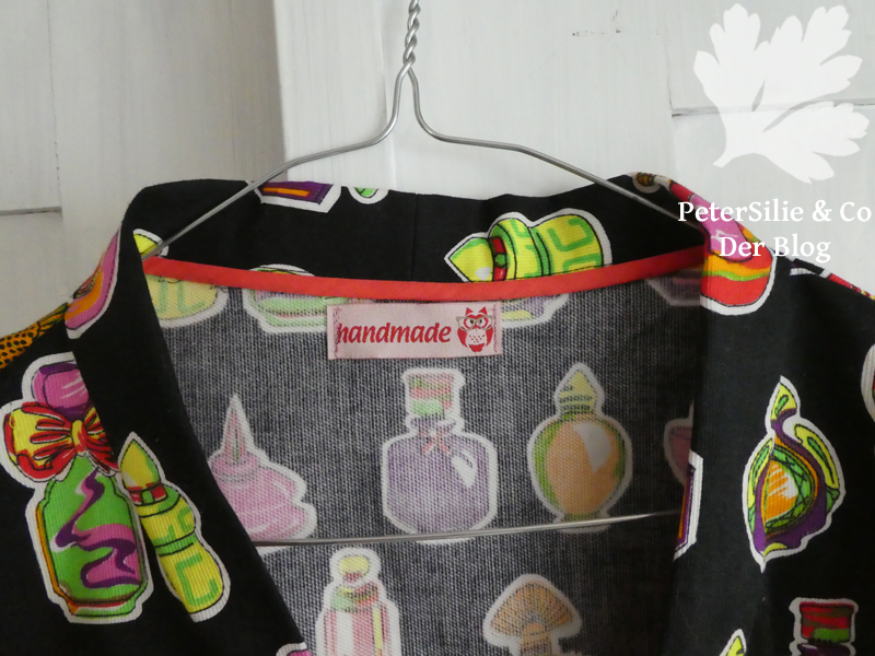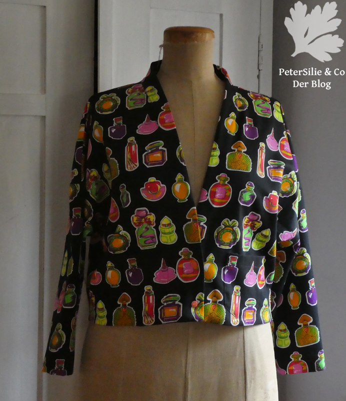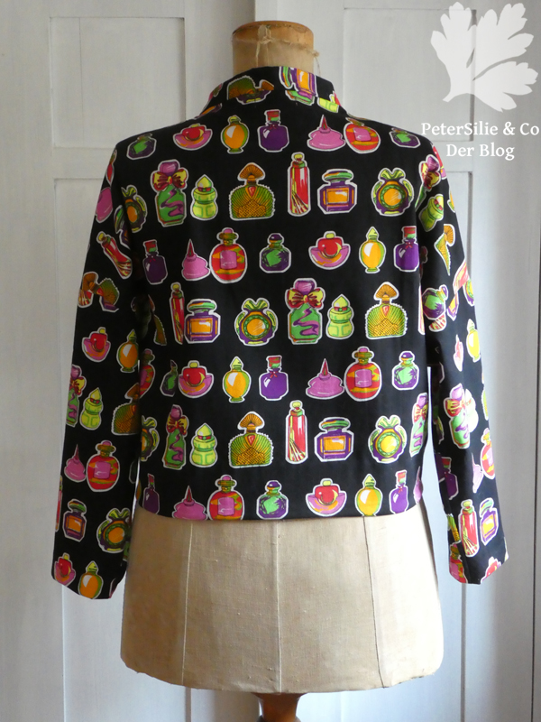 Allerdings war es nötig unten den Saum mithilfe von Besatzstreifen, aus den Resten, zu versäubern. Die Kanten von angeschnittenem Kragen und Ärmelsaum sind mit Schrägband eingefaßt, damit alles schöner aussieht, und von Hand festgenäht. Zudem erhielt die Jacke noch ein hübsches handmade Etikett. Die Jacke war schon komplett fertig, diesmal mit Snap Kams verschlossen, als ich mich entschied aus den Reststückchen doch noch Taschen zu nähen. Hier war es vor allem die Frage: Kann ich perfektes Mustermatching erreichen, also finde ich auf den Resten genau diese Parfümfläschchen? Ich hatte Glück und diese Jacke erhielt doch nochTaschen.