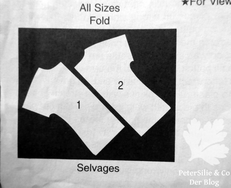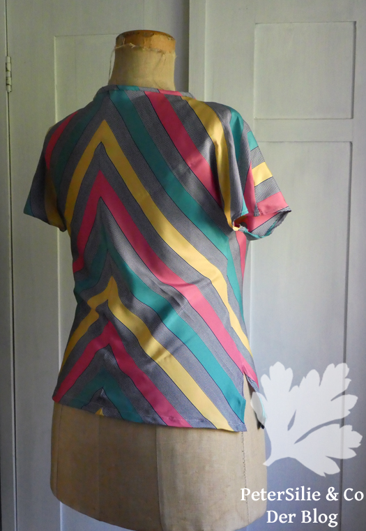 Dabei hat man natürlich einen extremen Stoffverschnitt, aber eine sehr effektvolle Wirkung. Mit dem Seidenstoff wäre sich das so gar nicht ausgegangen. Auf den Schnittteilen ist der Fadenlauf für den Streifenschrägschnitt übrigens korrekt angegeben, nur hatte ich mich mit solchen „Nebensächlichkeiten“ nicht abgegeben…