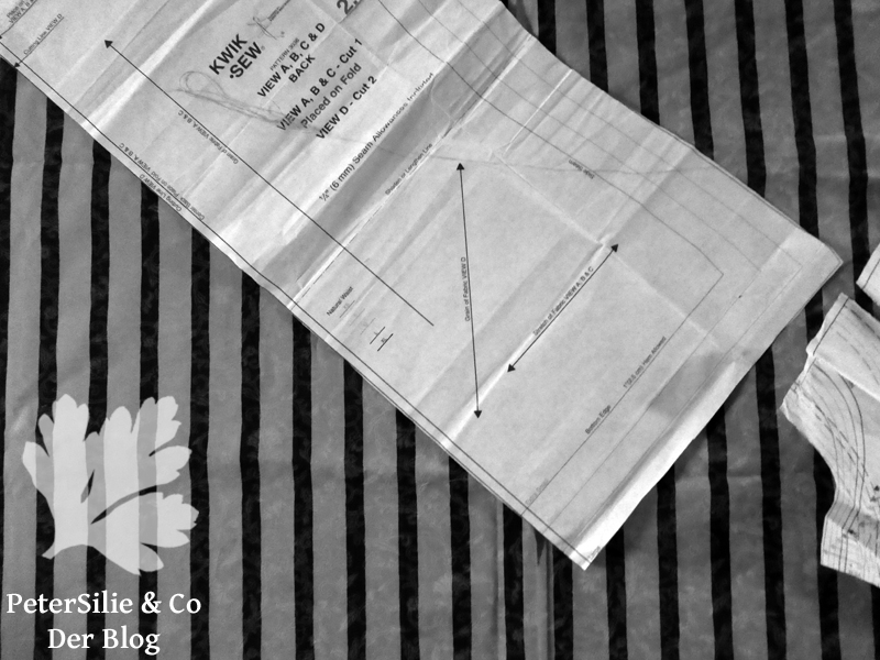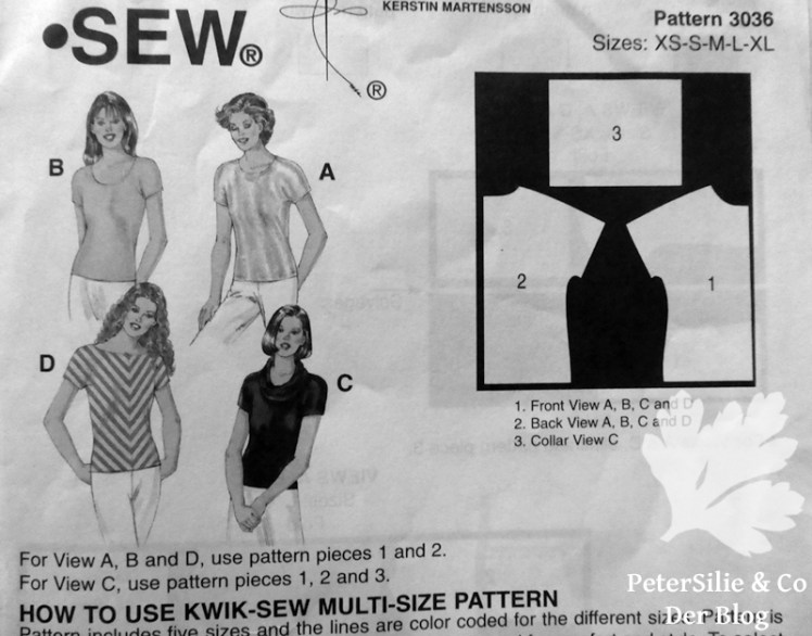 Mit Streifen ist es immer so eine Sache, quer, längs, diagonal- was wirkt am besten? Ich hatte da einen sehr einfachen Schnitt von Kwik.Sew Pattern 3036 im Kopf, an dem ich mich schon einmal vesucht hatte und das Endergebnis war, ja wie? Irgendwie glaube ich, nicht so recht gelungen. Warum weiß ich nicht mehr, aber ich wollte unbedingt einen weiteren Versuch wagen. Vielleicht hatte mir damals bloß der Stoff nicht gefallen oder war da was mit der Größe? Jedenfalls werden vier Blusenvarianten gezeigt, eine davon mit Streifen. Also legte ich den Schnitt auf, und zwar genau so wie auf dem Schema der Schnittauflage für mein Modell D.