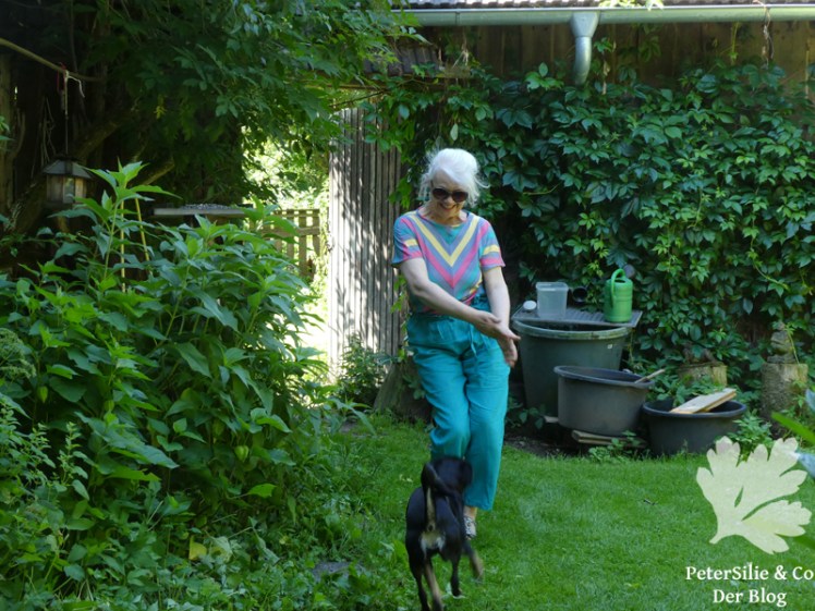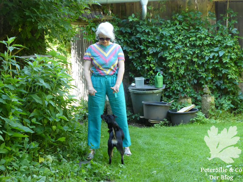 Ab und an überascht mich meine 84 jährige Mutter mit Stoffen, die sie irgendwo ausgegraben hat, bei ihren zaghaften Versuchen sich von ihren Stoffschätzen zu trennen. Genaugenommen weiß sie ja gar nicht mehr, was sie besitzt, denn sie näht seit zwanzig Jahren keine Kleidung mehr, sondern macht ausschließlich Patchworkarbeiten. Wie auch immer, darunter befand sich ein hochwertiger Seidenstoff, nur natürlich nicht unbedingt in einer Farbigkeit, bei der ich sofort Hurra geschrien hätte. Jetzt ist es aber so, dass ich letztes Jahr diese türkise Hose nähte (auch aus Omas Fundus…), die ich diesen Sommer erst auf ihre „mag ich sie überhaupt“ Tauglichkeit testete, immerhin erfolgreich. Also dachte ich: „Der Stoff passt prima dazu, los geht’s“.