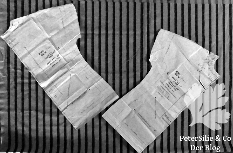 Nachgedacht habe ich nicht darüber, dazu war es zu heiß. Der schönste Moment, nach dem Zuschneiden, ist für mich das Aufstecken der Teile an der Puppe, da sehe ich dann schon so ein bißchen etwas von der Wirkung des Modells. Vorne hatte ich tatsächlich ein wunderschönes Patternmatching, ich war begeistert.