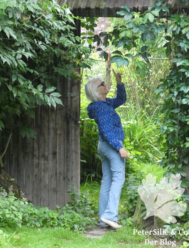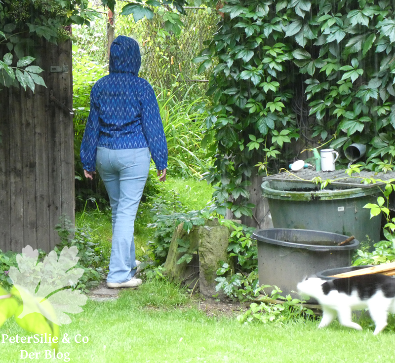 Diese Art Ikatstoffe ist wunderbar zu nähen und sehr gut zu tragen. Das spricht sehr zugunsten der Bluse. Der zweite Punkt ist, dass ich zur Zeit eher einen Mangel an Langarmblusen habe. Bei uns in der Gegend wird es sehr schnell kalt. Zwei, drei Sommerregentage und schon wird es in den alten Mauern unseres Hauses gruftig und man träumt schon wieder vom kuscheligen Ofen. Kurz- oder Dreiviertelarm ist da zu kalt. Außerdem befinden wir uns in einer richtigen Aprilwettersituation: mal Nieselregen, dann Sonne, schwarze Wolken, Wind, Sturzregen…Jedenfalls kam die Meereswellen-Bluse wieder zum Einsatz und Sabine meinte: Aber die ist ja hübsch! Das entschied die Sache. Wir beschlossen gleich Fotos zu machen. Kaum hatten wir den Hund angeleint (er sollte auch mit) und waren aus der Tür, als es zu regnen begann…Worauf unsere Twinni gleich einen Rückzug machte und, zugegeben, das Fotografieren im Freien mit Kamera bei wechselnder Regenstärke und nach Hause drängelndem Hund ist schwierig. Daher ging es -ohne Hund, der hatte sich gleich in sein Bett verzogen- in den Hof. Dorthin allerdings begleitete uns trotz zunehmendem Regens unser Kater Monet (jetzt kommt das große Bilderrätsel: Monet ist auf allen Fotos unten mit drauf, allerdings nur auf zwei zu sehen. Gefunden?).