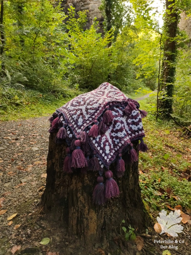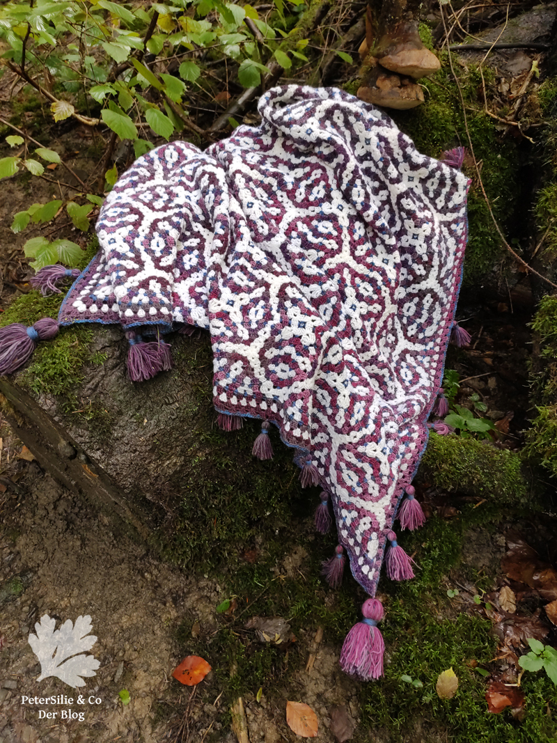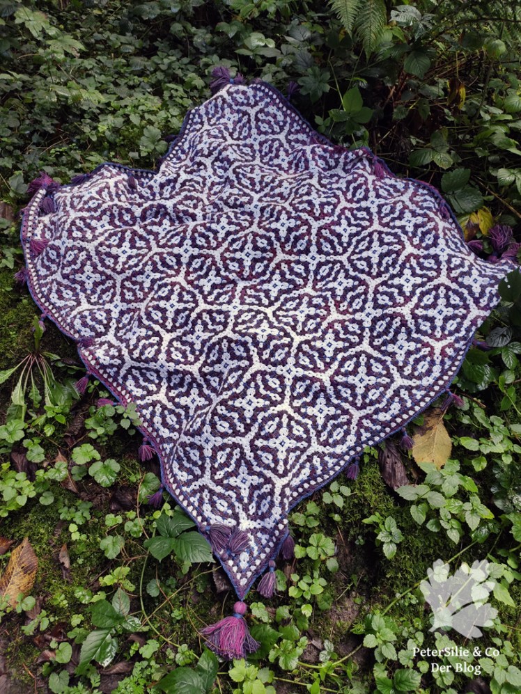 Die Decke ist sehr dekorativ, die Edelsteinfarben leuchten, der blaue Rand ist ein perfekter Abschluss. Aber – Troddeln herzustellen nimmt doch auch viel Zeit in Anspruch ! Hier gefallen sie mir als Abschluss sehr gut, sie geben der Decke eine orientalische Note, die auch zum Mosaikmuster passt.