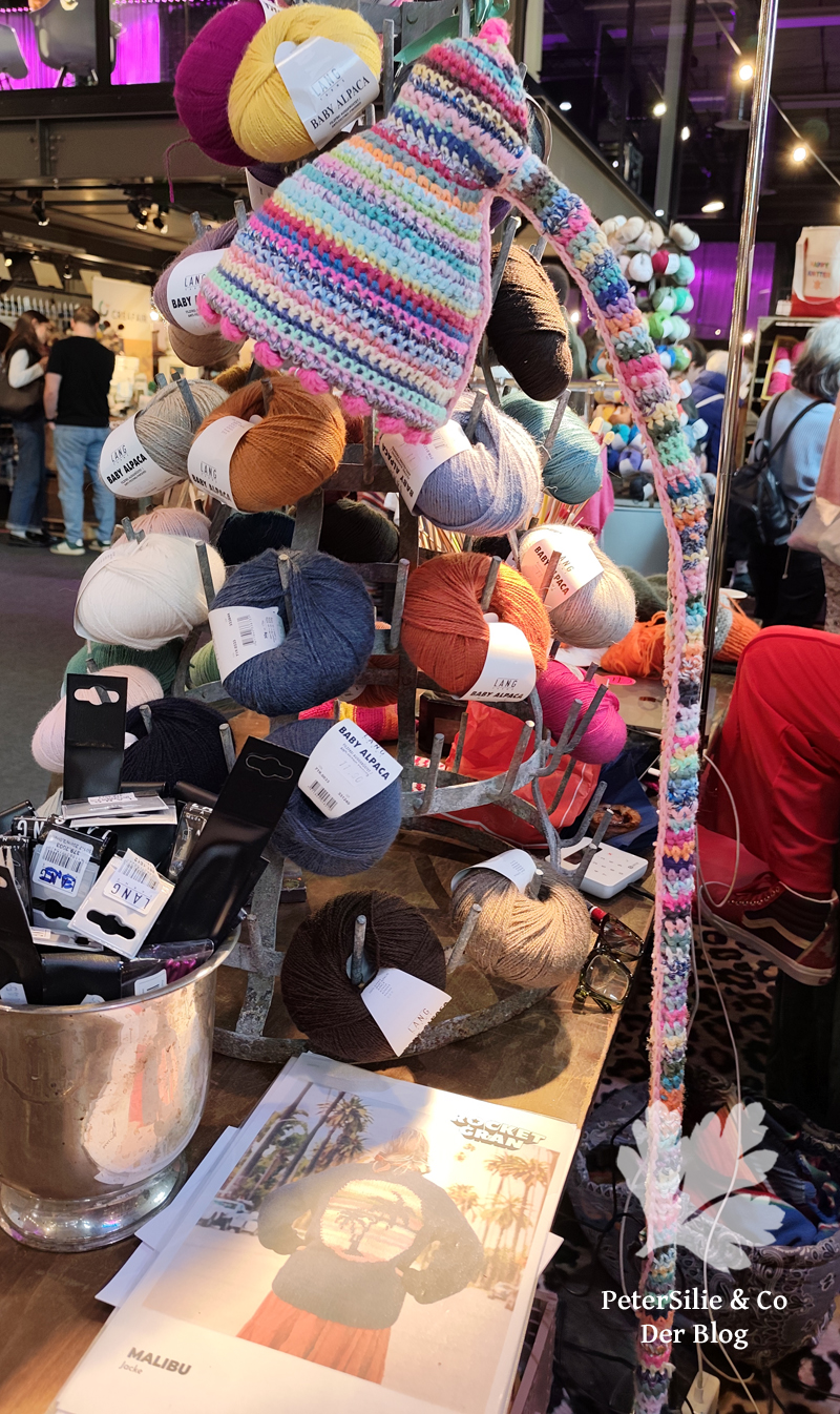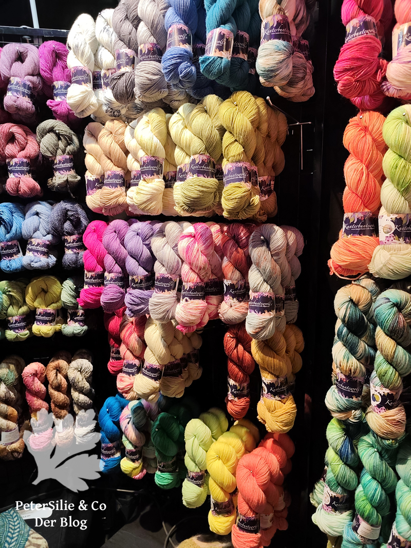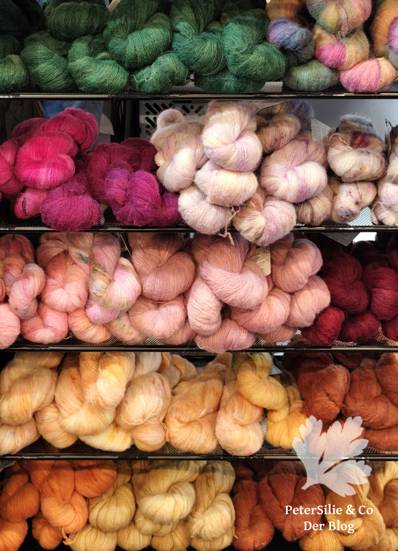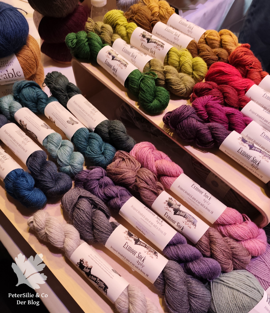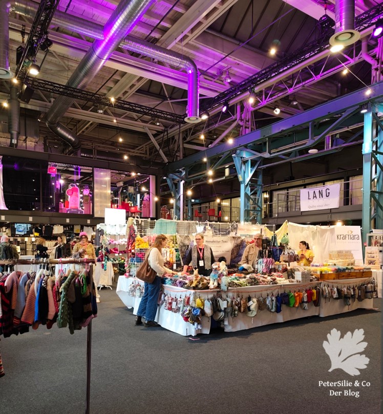 Ich glaube, wenn es einen Stand mit so Nackenlampen zum um den Hals legen oder Stirnlampen gegeben hätte, da hätten die Lampen reissend Absatz gefunden. Rückblickend habe ich tatsächlich nur an jenen Ständen Wolle erworben, die ein wenig Tageslicht hatten, an einer der Hallenseite gab es ein bisschen Tageslicht und auf der anderen Seite war es einfach schummrig mit Kunstlicht. Eine nette Atmosphäre, aber schrecklich, um die Farben gut zu erkennen. Ich habe mir schon das eine oder andere Mal die Finger verbrannt, mit bei schlechtem Licht gekaufter Wolle, auch in vielen Läden ist das Licht nicht perfekt. Da gab es schon ein paar unerwartete Überraschungen. Im Gespräch mit einer Standbetreiberin, erzählt mir diese, dass sie zuerst dachte, dass ihr Platz nicht der beste sei, aber dank der Fenster mit nicht komplett zugezogenen Vorhängen, hatte sie doch sehr Glück gehabt. Licht und Lichttemperatur können so viel veränderen. Vereinzelt gibt es in besseren Möbelläden, die Option Musterstücke von Möbelstoffen in einer Box unter unterschiedlichen Lichtern zu betrachten. Das wäre doch was für solche Events.