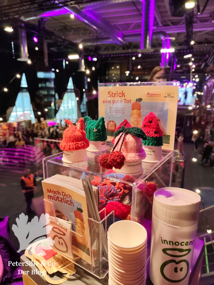 Das erste Ziel, auf meinem Wunsch, war die Bühne, ich wollte den Vortrag von Honsedesign sehen. (Es wird übrigens Hunse ausgesprochen) Vor der Bühne gab es lange Tischreihen, perfekt zum Hinsetzen, etwas essen, Pause machen oder Stricken, theoretisch, mir persönlich war das Licht zu dunkel und zu pink. Ein wiederkehrendes Thema. Ich hatte mir zwar am Vorabend noch ein kleines Projekt zum Mitnehmen gestartet, aber in Kombination aus dem Licht, meiner lila merlierten Wolle und einem neuen Häkelmuster, lies ich mein Projekt lieber in der Tasche. Es gab auch noch verschiedene Lounges, die Quiet Lounge, die Innocent Lounge (kostenlose Smoothies gesponsert von Innocent und es wurde dazu eingeladen Mützchen für ein caritatives Projekt in Zusammenarbeit mit Pro Senectute zu stricken, es wurde auch Wolle und Nadeln zur Verfügung gestellt) und die Coffee Lounge (da gab es oft Schlangen beim Barista). Die Beleuchtung, ihr ahnt es, sehr pink.