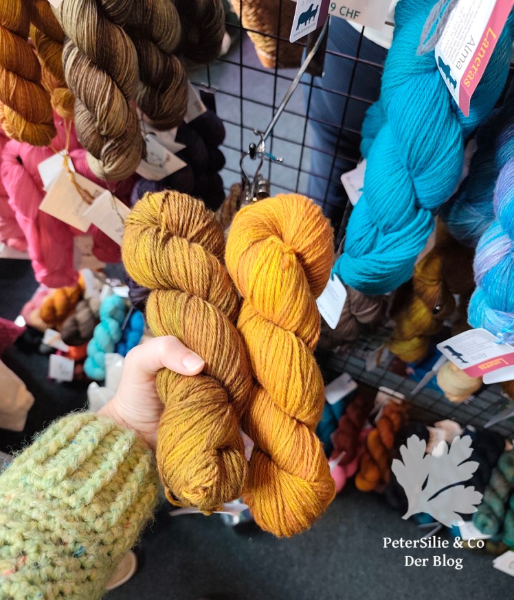Und natürlich stürzten wir uns ins Getümmel an den Wollständen, jede von uns dreien mit einem anderen Fokus. Ich hatte mir für fünf verschiedene Projekte genau notiert wie viele Meter und welches Gewicht es sein sollte. Ziemlich schnell kaufte ich mir dann auch meine ersten vier Stränge, ein Ocker-Kurkuma Farbton in DK, Alma von Laneras. Ich mag einfach die leichte Meliertheit der Wolle und habe schon einige ihrer dünneren Fingering/Sportweight Stränge.