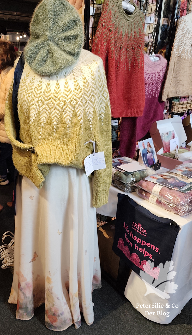 Und natürlich mussten wir die ausgestellten Häkel- und Strickpullis, ich insbesonders die Häkelpullis, von Honsedesign und Nomadstitches betätscheln. Wann sonst hat man die Möglichkeit direkt das Originalmodell des Designers zu bewundern und zu gucken, wie fühlt es sich in echt an. Diese waren wenig elegant diebstahlsicher verkabelt, es ist schade, dass Sorge besteht, dass jemand eines der Modelle klauen würde. Alle Modelle hatten auch einen Zettel mit allen Infos, allerdings nur auf Kopierpapier gedruckt, so sahen die sehr schnell sehr mitgenommen und schmuddelig aus. Ein bisschen festerer Fotokarton oder das Papier auf Pappe aufgezogen, hätte das Ganze gleich besser aussehen lassen.