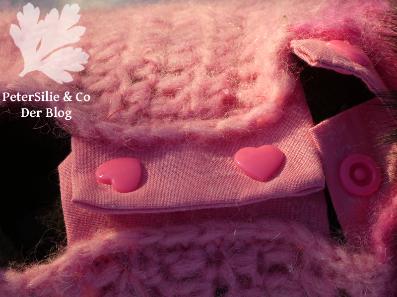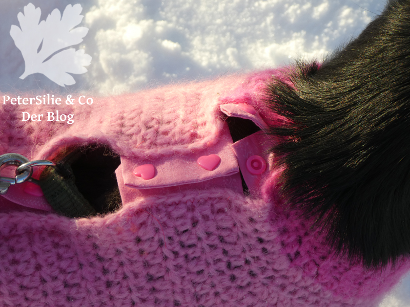 Twinni war wirklich ein extrem gutes Anprobemodell und ich kam sehr gut voran, so war nach zwei Nachmittagen häkeln das Mäntelchen fertig. Schön in Form dämpfen und die Montage der Verschlüsse übernahm Mama. Da die Kletterfront gerade etwas schwach bestückt war, gab es dieses mal Kam Snaps. Dauert etwas länger beim Verschliessen als Klett, also nix für ratzfatz raus in der Früh, aber für den entspannten Spaziergang oder in die Hundeschule…