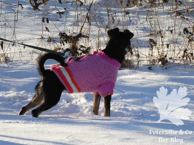Braucht Twinni Hundemäntel? Vielleicht, sie hat kurzes Haar und nicht so viel Masse, allerdings ist sie bei Spaziergängen auch sehr aktiv, nur wenn es ganz kalt ist, bekommt sie Raureif an Fellspitzen am Schwanz, Öhrchen und Mund, greift man allerdings unters Mäntelchen, ist sie ganz warm.