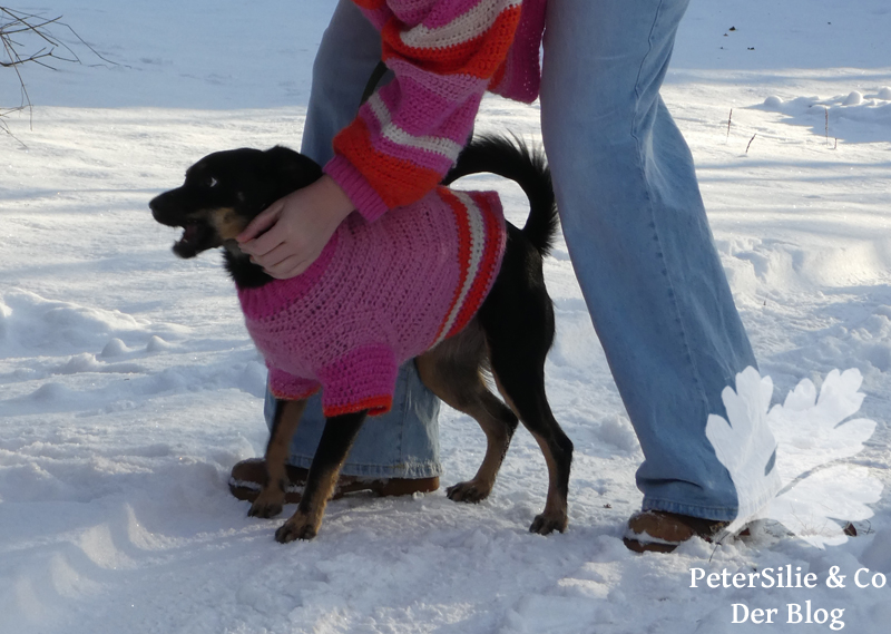 Nachdem Pulli hatte ich reichlich Reste und dann kam, nachdem ich wusste Weihnachten bin ich wieder bei meinen Eltern und Twinni, die Idee ich könnte ihr doch ein Mäntelchen im Partnerlook häkeln. Auch hier habe ich ohne Muster gearbeitet und mir nur grob überlegt, wie ich den Mantel häkle. Die Form eines Hundes zu umhäkeln ist doch ein bisschen schwieriger als einen Menschen zu umhäkeln oder vielleicht bin ich in dem einen erfahrenener. Twinni war netterweise extrem geduldig und lies jede Anprobe entspannt über sich ergehen.