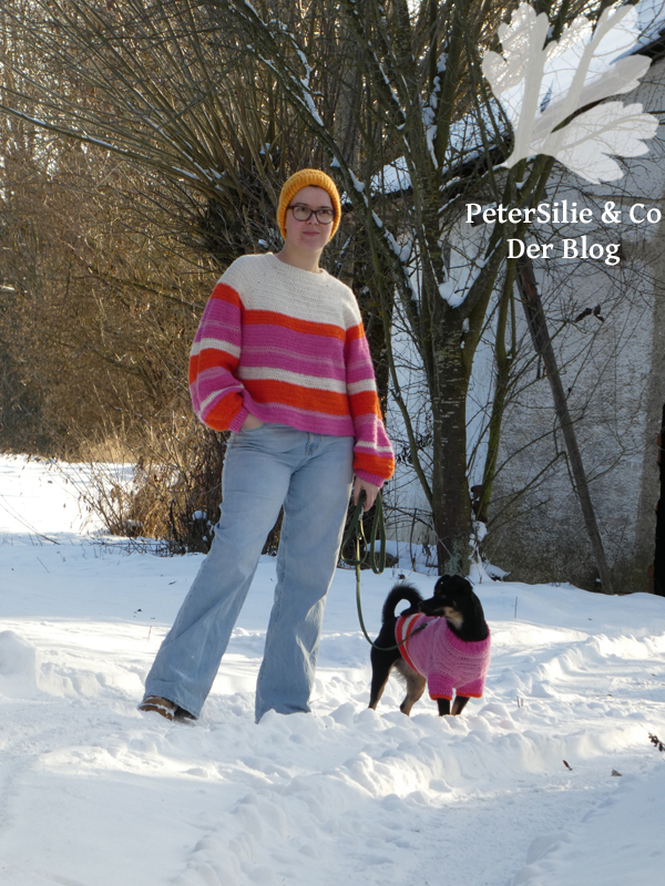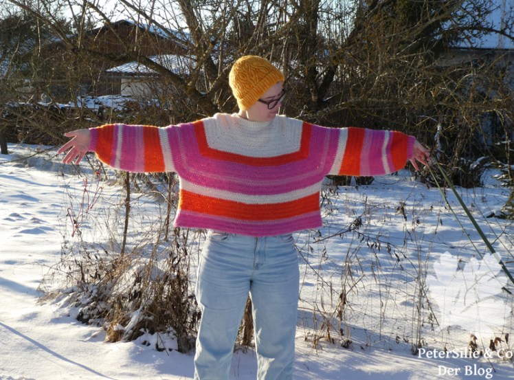 Fazit: Zwei Pullover, einmal extra gemütlich und oversized für mich. Vielleicht nicht, wenn ich ehrlich bin, mit Farben, die meine erste Wahl sind. Aber ich bin zufrieden mit dem Ergebnis, und dass es ein unkomplizierter „einfach anziehen“ Pulli ist. Und auch mit Twinnis Mantel bin ich zufrieden, er ist nicht perfekt, aber ich habe schon neu gelernte Dinge anwenden können und ganz gut ihre Form umhäkelt.