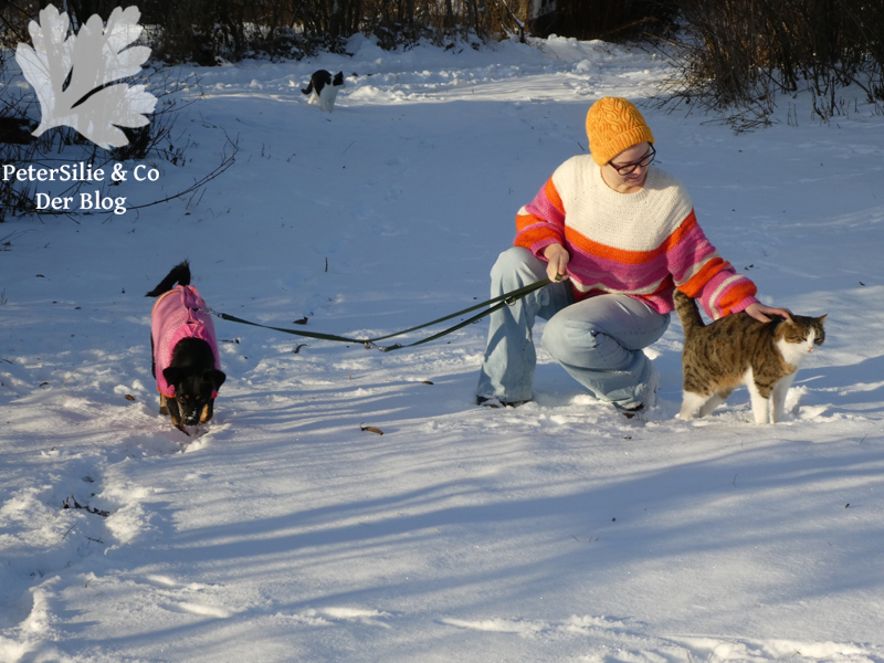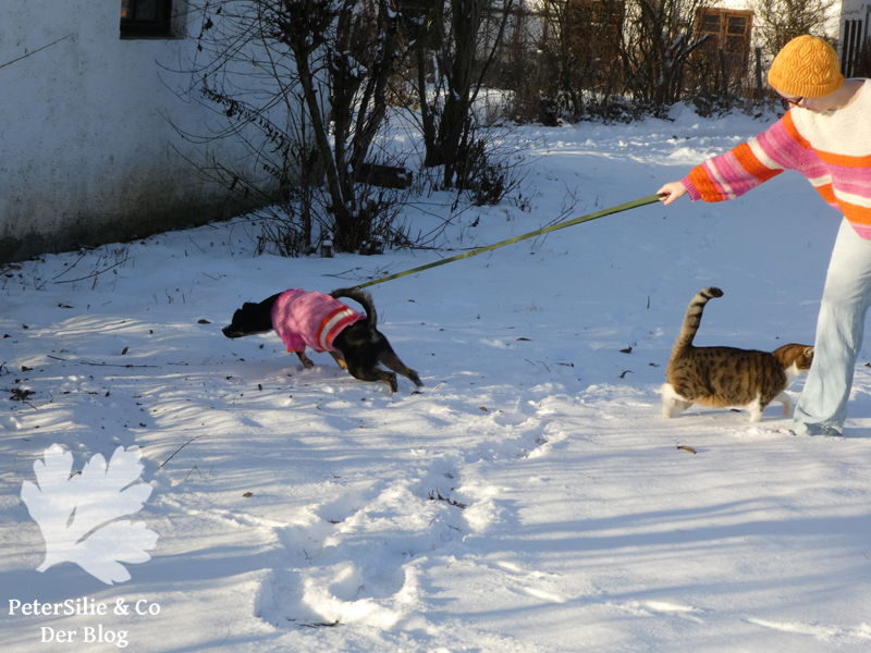 Die Ärmelchen machen das schon extrem routinierte Mantel ziehen einen Tick komplizierter, in die Ärmel muss schon gezielter eingefädelt werden. Aber wenn es nicht sofort rausgeht ist Twinni geduldig, sie weiss, was das übliche Programm vorm Spaziergang ist.