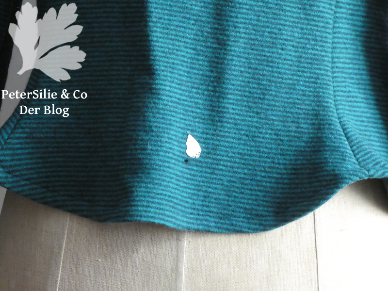 Ich habe wieder einmal ein paar Stoffe aus dem Schrank meiner Mutter mitgenommen. Natürlich besteht immer ein gewisses Risiko, dass sich zwischenzeitlich eine oder mehrere Generationen Motten an diesen lange liegengelassenen Stoffen in stillen Schrankwinkeln erfreut haben. Oberflächlich betrachtet sahen die Stoffe sehr gut aus. Trotzdem habe ich sie vorsichtshalber alle einmal gewaschen. Darunter befand sich auch ein sehr schöner Strickstoff mit schmalen grün/blauen Streifen. Diesen habe ich mit den anderen fröhlich in die Maschine gesteckt-bei 40Grad- und gleich einmal verwaschen. Er kam gewissermaßen als eleganter Walk heraus. Na schön, dachte ich, jetzt brauche ich die Kanten nicht versäubern. Genau angeguckt habe ich ihn wieder nicht. Dann habe ich Tage später spontan beschlossen zuzuschneiden. Es sollte ein Probemodell für den Schnitt 112 aus Burda 3/2025 sein. Dafür sind solche „Stofferbschaften“ ideal, man tut sich leichter bei Versuchen, zumindest bei mir ist das so. Jedenfalls habe ich erst nach dem Zuschnitt bemerkt, dass der Stoff leichte Mottenfraßspuren und zu allem Überfluss ein richtiges Loch am unteren Rückenteil hat. Das mit den Fraßspuren ist nicht so schlimm nach dem unfreiwilligen Walken, jetzt sieht man es nur, wenn man es weiß. Aber das Loch! Ich hätte garantiert anders auflegen können, wenn, ja wenn ich es vorher gesehen hätte. Zuerst habe ich überlegt, ob ich alles wegschmeißen soll. Dann dachte ich, na zusammennähen kannst du ja zum Testen. Später fand ich, das wäre ein idealer Fall für kreatives Flicken und Sticken…