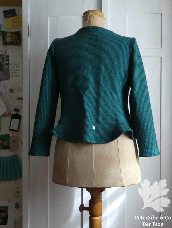 Zum Beispiel könnte man darüber applizieren oder ganz avantgardistisch noch mehr Löcher dazu machen? Ich könnte aus den Reststücken dreidimensional Elemente aufnähen und Perlen oder Stickgarn verwenden. Geometrische Formen schaffen oder doch vielleicht vegetative Blatt- und Blumenformen? Jetzt erschien mir das Modell plötzlich sehr wertvoll, weil es so viele Möglichkeiten der Ausgestaltung gab… Letztlich entschied ich mich für Stickerei mit feinem Wollgarn, Blumen und Punkte, alles Ton in Ton, also fast nicht wahrnehmbar. Einmal habe ich im Herbst die Jacke getragen. Wir hatten sogar schon Fotos gemacht, aber trotzdem war ich mit der Gesamtwirkung des Schnitts nicht ganz zufrieden. Durch den doch relativ stark stehenden Stoff wirken die angeschnittenen Schößchen irgendwie seltsam. Zudem hatte ich der Jacke noch Knöpfe verpasst, die eher für einen Mantel taugen würden (farblich sehr gut passend, aber recht altmodisch wirkend) und ziemlich plumpe Schlaufen aus Stoffstreifen dazu genäht. Das war nicht überzeugend. Daher erhielt das Stück erst einmal eine Pause- im Schrank, passenderweise hing die Jacke zwischen fertigen und unfertigen Modellen.