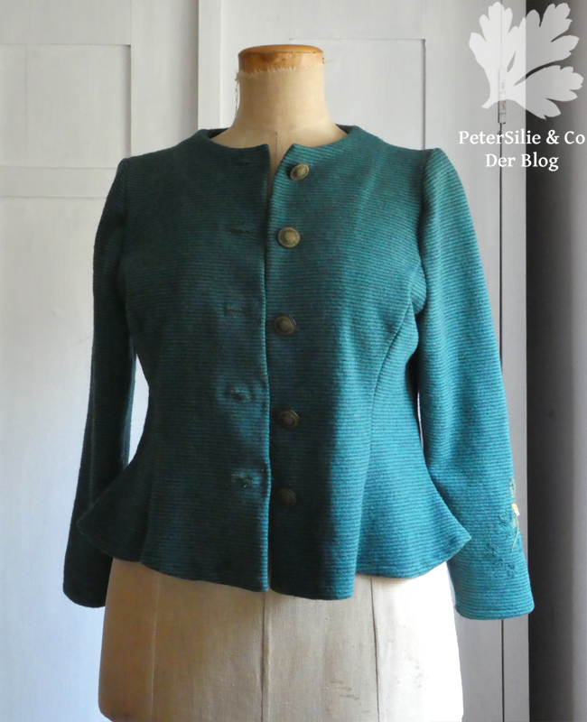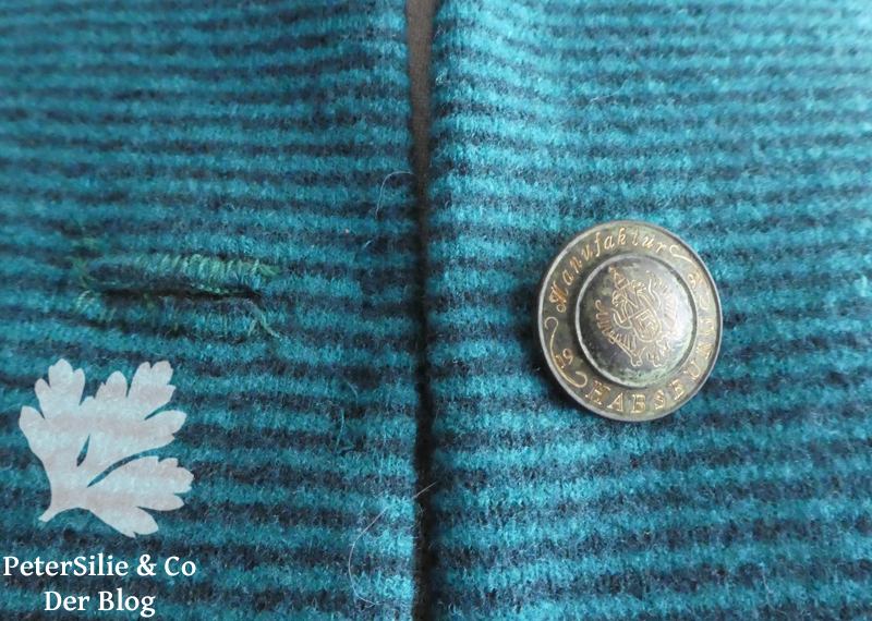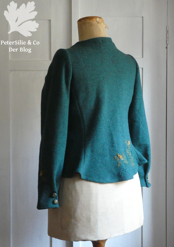 Bei der kritischer Durchsicht meiner Jacken- für die eine oder andere hege ich Umarbeitungspläne um sie alltagstauglicher zu machen, kam die Jacke wieder zum Vorschein. Am meisten störte mich mein Verschluss. Also schnitt ich die Knöpfe und Schlaufen ab. Ich wusste eine Knopfleiste würde dem Schnitt eher entsprechen und entschied mich tapfer für Knopflöcher- handgenäht. Das habe ich seit ewigen Zeiten nicht gemacht. Sie sind jetzt nicht über drüber, in der Gesamtwirkung fügen sie sich aber gut ein. Es gibt der Jacke einen rustikaleren Look. Die Knöpfe tauschte ich ebenfalls, es sind trachtig angehauchte Metallknöpfe in olivgrün mit ockerfarbener Schrift (“ Manufaktur Habsburg“ mit Adler).Kleine, dazugehörige Pseudolederknöpfe nähte ich an die Ärmel, diese erhielten eine gelegte Falte. Dadurch bekam die Jacke eher das Aussehen eines Trachtenjankers. Außerdem wollte ich diese Farben der Knöpfe in der Stickerei wieder aufgreifen. Also stickte ich zu der vorhandenen Stickerei neue, etwas anders gestaltete Ranken mit feiner Wolle. Das Ganze wirkt jetzt sehr apart.