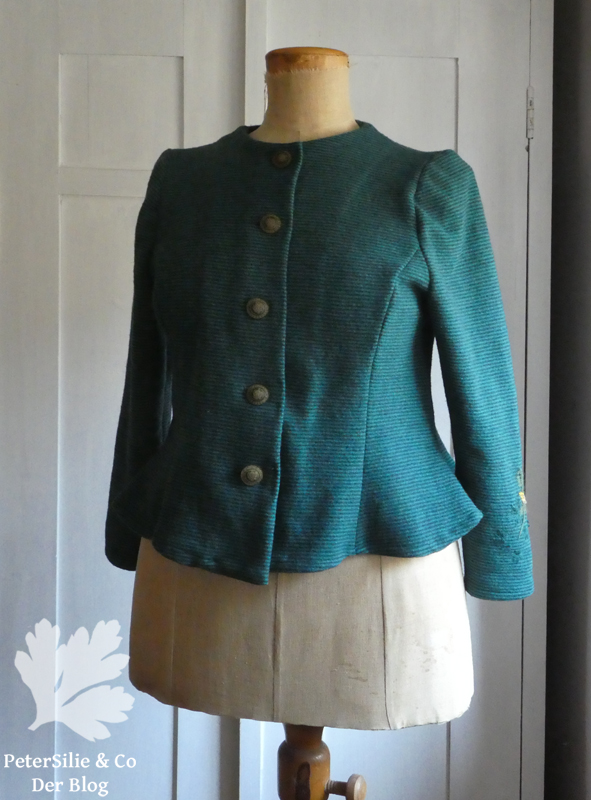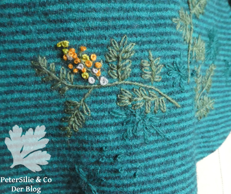 Fazit: Schön warm, mittlerweile ist daraus- nicht ganz freiwillig mit Umwegen- eine tragbare und hübsche Version für mich geworden. Das Original ist aus Waffelstrick, also aus einem viel weicherem Material. Außerdem habe ich eine zu große Größe genommen, bei mir hat noch ein Pulli drunter platz, was aber in unserer Gegend ein Vorteil ist. Aber mit meiner Stickerei bin ich sehr zufrieden und jetzt wurde eben ein trachtiger Janker draus…