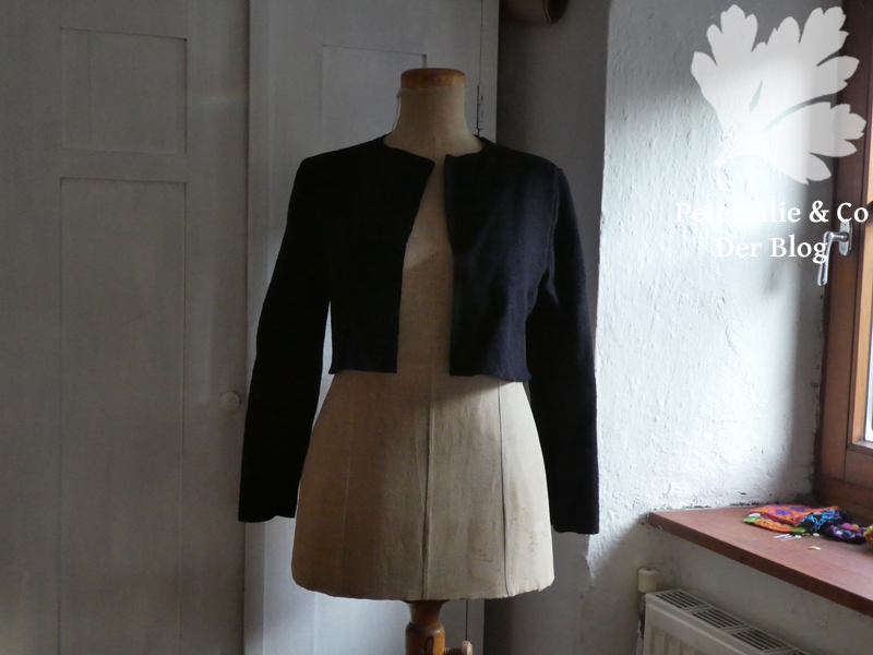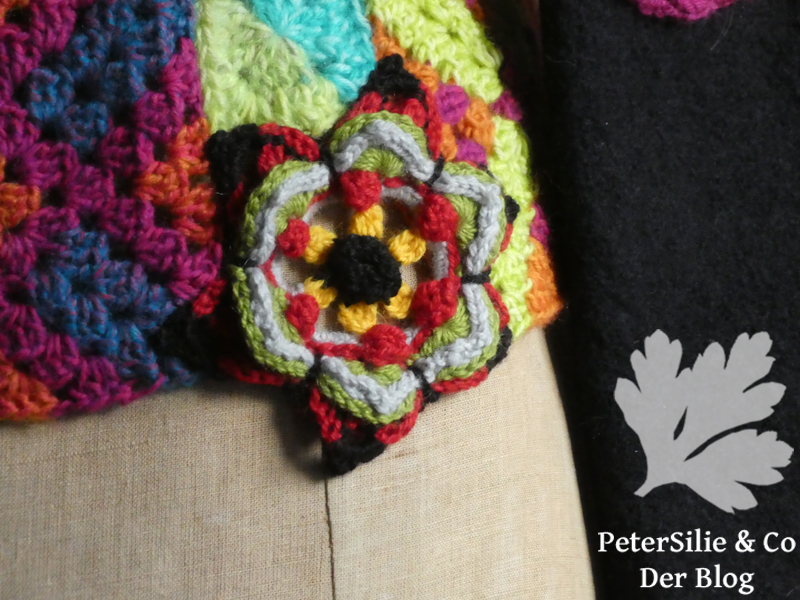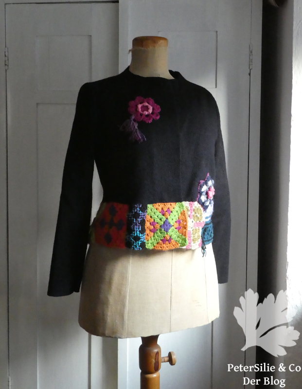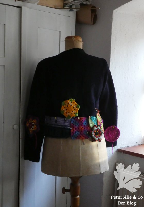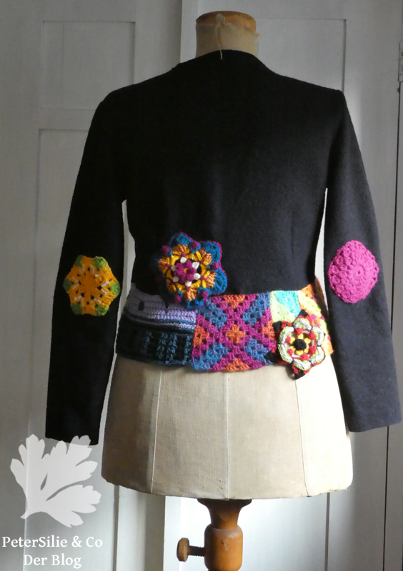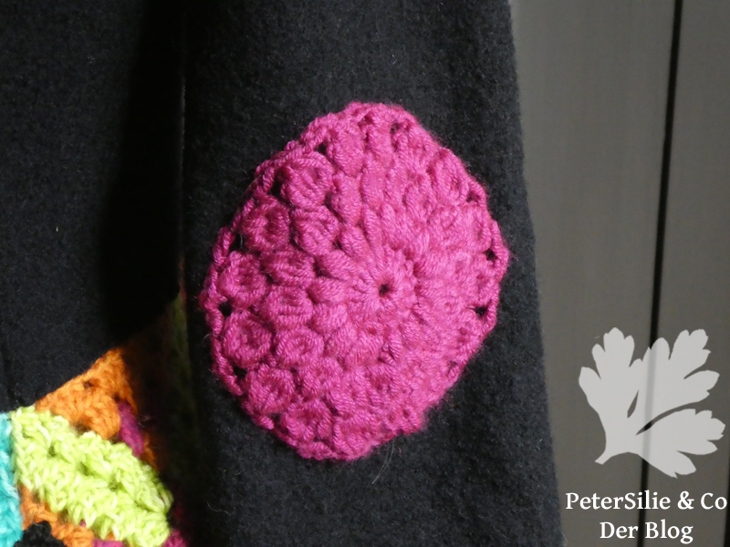 Die übriggebliebenen Grannysquares landeten wieder in einem Sammelkörbchen, wurden im nächsten Winter, Sommer und dem darauffolgenden Winter weiter ergänzt von Sabine. Ja, ja, wie die Zeit vergeht… Jedenfalls bin ich gerade dabei im Nähzimmer Ordnung zu machen und fand zwischen Stoffen eine kurze Strickwalkjacke. Diese Jacke hatte ursprünglich Volants in der Taille, eines oder zwei, so genau weiß ich das nicht mehr. Jedenfalls fehlten diese bereits. Es hatte mich damals nicht überzeugt. Später wollte ich eine taillenkurze Dirndljacke darausmachen, die sah aber erst recht ziemlich doof aus (oder ich darin?). So verschwand das unfertige Modell im Schrank und wurde dort unter Stoffen begraben. Jetzt aber wusste ich genau, was ich damit machen wollte. Ich würde farbenfrohe Mustergrannys annähen. Ich hatte schon einmal eine Häkeljacke mit vorhandenen Grannys und schwarzen Ergänzungen gemacht, das ist aber sehr, sehr lange her. Diese Jacke besitze ich schon lang nicht mehr. Aber inspiriert von Game of Wool wollte ich jetzt eine neue Auflage der alten Idee machen. Ich habe aus allen vorhandenen Grannys die ausgewählt, die den wolligsten Charakter haben. Strickwalk ist zwar weich, aber eben sehr warm. Baumwollgarngrannys würden nicht die ideale Ergänzung sein. Angesteckt waren die Grannys und ein Teststück von einem Mosaikmuster rasch. Es fehlte ein kleines Stück, daher füllte ich diese Lücke mit einem Reststück von Twinnis grünen Mantel und einem sternförmigen Motiv, das keck über die Kante schaut. Da noch einige sternförmige Stücke übrig waren, kamen zwei auf die Ärmel und die anderen wachsen in den schwarzen Teil der Jacke hinein. (Ich wollte sie nämlich unbedingt unterbringen). Die Idee die Ärmelgrannys als Ellbogenpatches zu denken, ergab sich beim Nähen. Verschlossen wird die Jacke mit großen schwarzen Druckknöpfen.