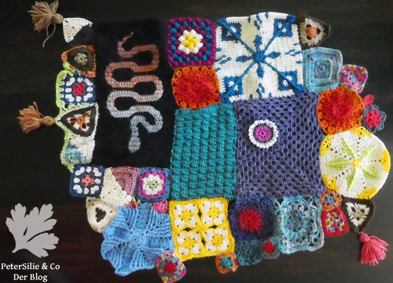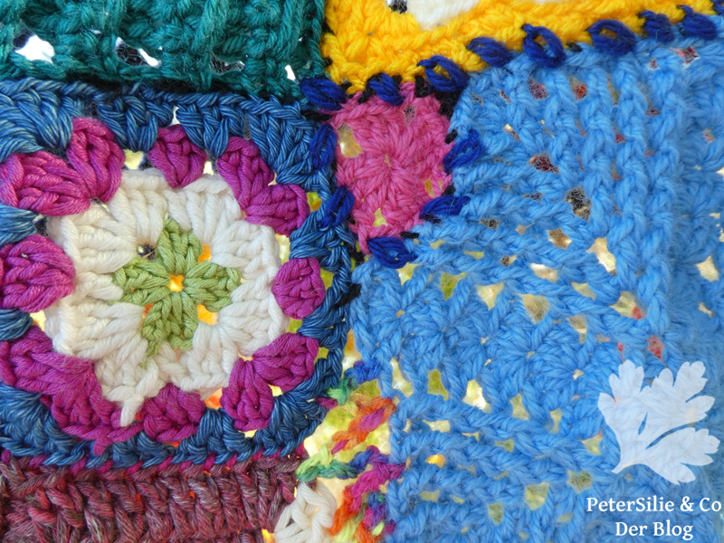 Sabine zaubert ein schönes Häkelprojekt nach dem anderen. Bei mir dagegen gab es einen ziemlichen Durcheinander im Wolldepot (einer alten Bauertruhe). Also nahmen wir uns meine kunterbunte Wollsammlung vor und sortierten sie neu. Dabei fanden sich auch eine Reihe Musterstücke von Granny Squares, gehäkelt überwiegend von Sabine, manche von mir und einige von meiner Mutter. Also legten wir sie zur Seite, damit ich „irgendwas“ damit machen konnte. Irgendwas trifft es genau, denn ich hatte keine Ahnung was ich machen könnte und ob mir etwas einfällt. Also nahm ich die Fleckchen mit mir um damit ein bißchen herumzuspielen. Die einzelnen Grannys sind höchst unterschiedlich in Größe, Material, Gestaltung und Farbe, irgendwie passt wenig zusammen. Aber genau das macht es interessant.