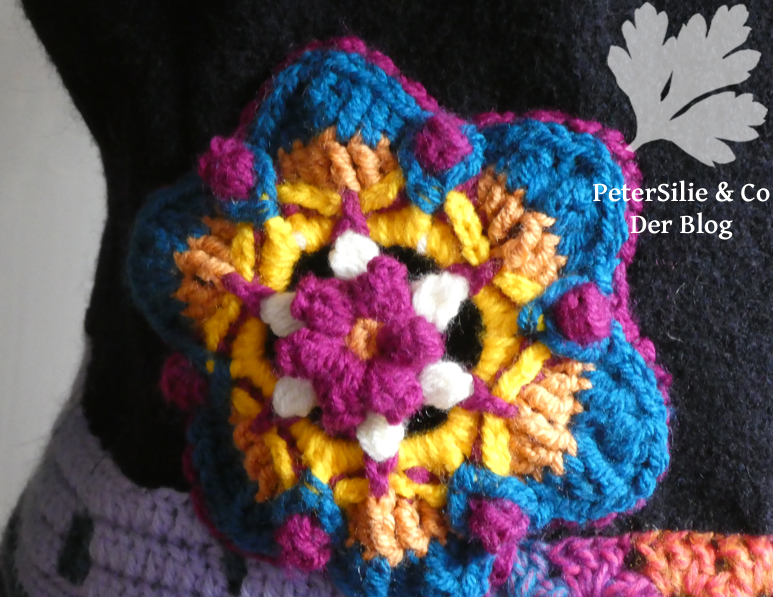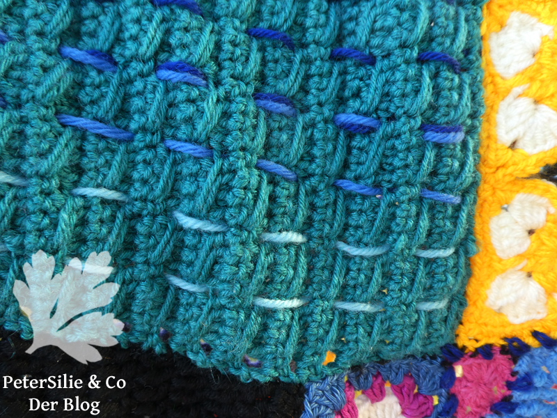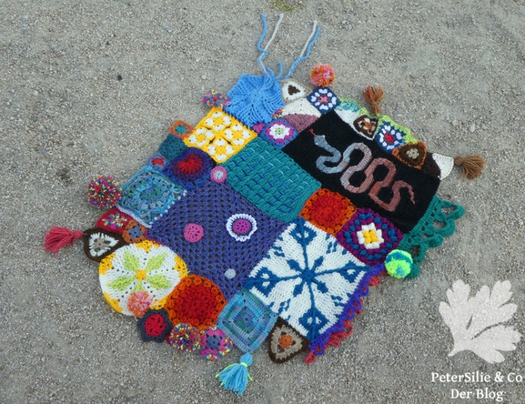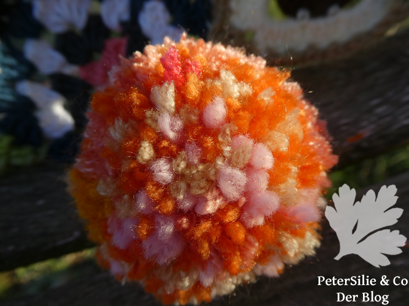 Die zweite Idee war die Grannysquares zusätzlich zu besticken, um sie mehr zusammenzuführen. Sticken und Häkeln ist jetzt aber wirklich nicht so eine ideale Verbindung wie Stricken und Häkeln…Das wurde mir erst klar nachdem ich mit Faden und Sticknadel da saß. Ich habe trotzdem hier und da etwas versucht. Dabei kamen mir auch die Musterquasten in den Sinn und diese fanden natürlich sofort einen Platz in meinem „crazy Catbed“. Die Pompoms hat Sabine gewickelt.