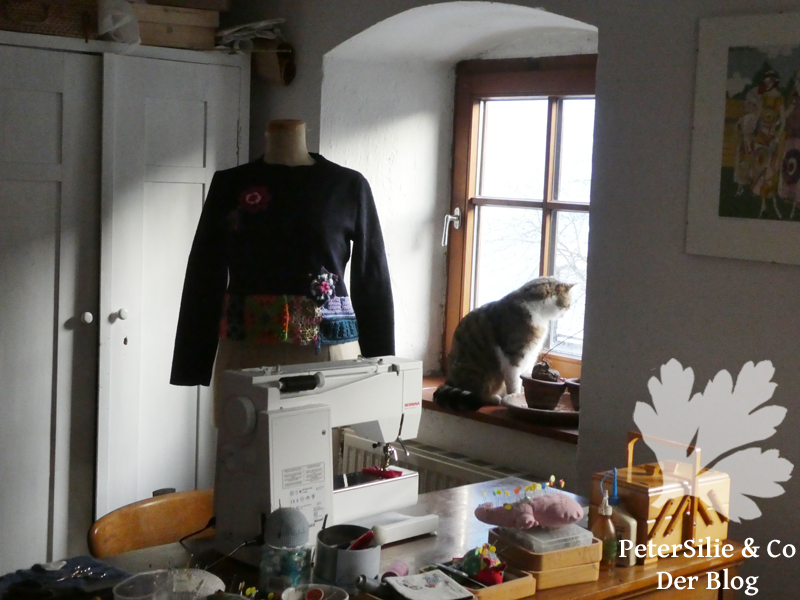 Fazit: Ich arbeite am liebsten mit vorhandenem Material und Abfällen. Ich brauche sozusagen ein bißchen Durcheinander und das zufällige Treffen von verschiedenen Stoffen, Borten, Häkelstücken…Da quillt der große Arbeitstisch dann immer über vor möglichen interessanten Partnern und es wird oft gar nichts draus. Aber es ergeben sich immer wieder neue Möglichkeiten. Darum mache ich auch Collagen gerne oder Mosaik.